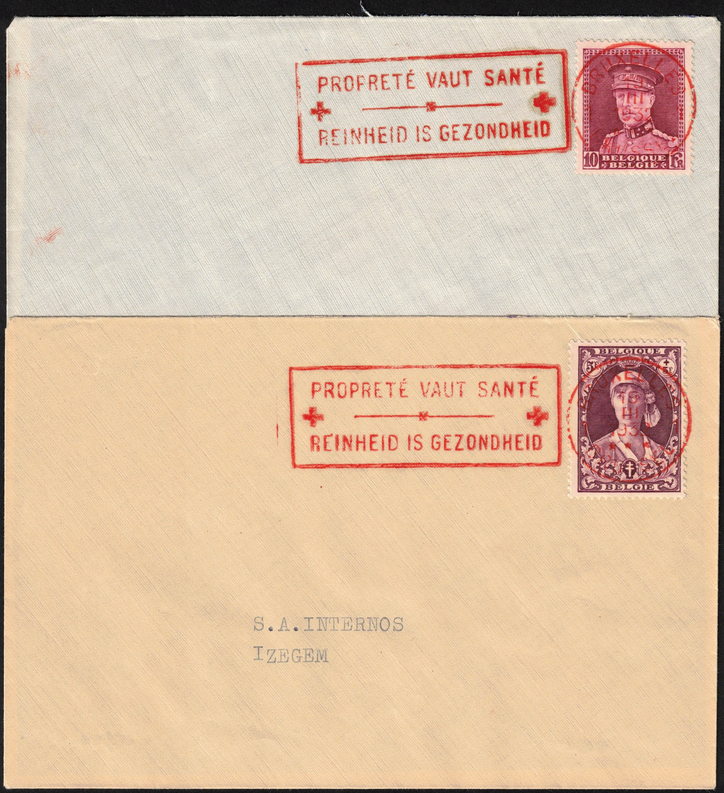 1929/1931 - KP 1/2 (2 env) - KP 3/11 (7 env) - 276/288A (7 env) - 317/24 (8 env sans le 322A) - 326/32 (5 env), obl en rouge Bruxelles 19/III/32 + encadré en rouge 'Propreté vaut santé/Reinheid is gezonheid'.'