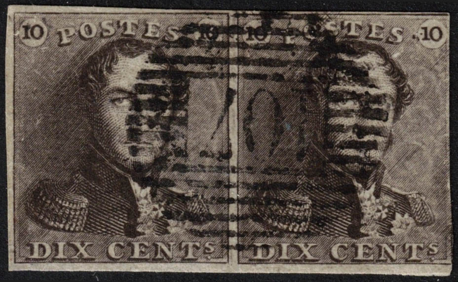 1 en paire, 1 timbre au filet coté droit, obl centrale P 107 de Seneffe.