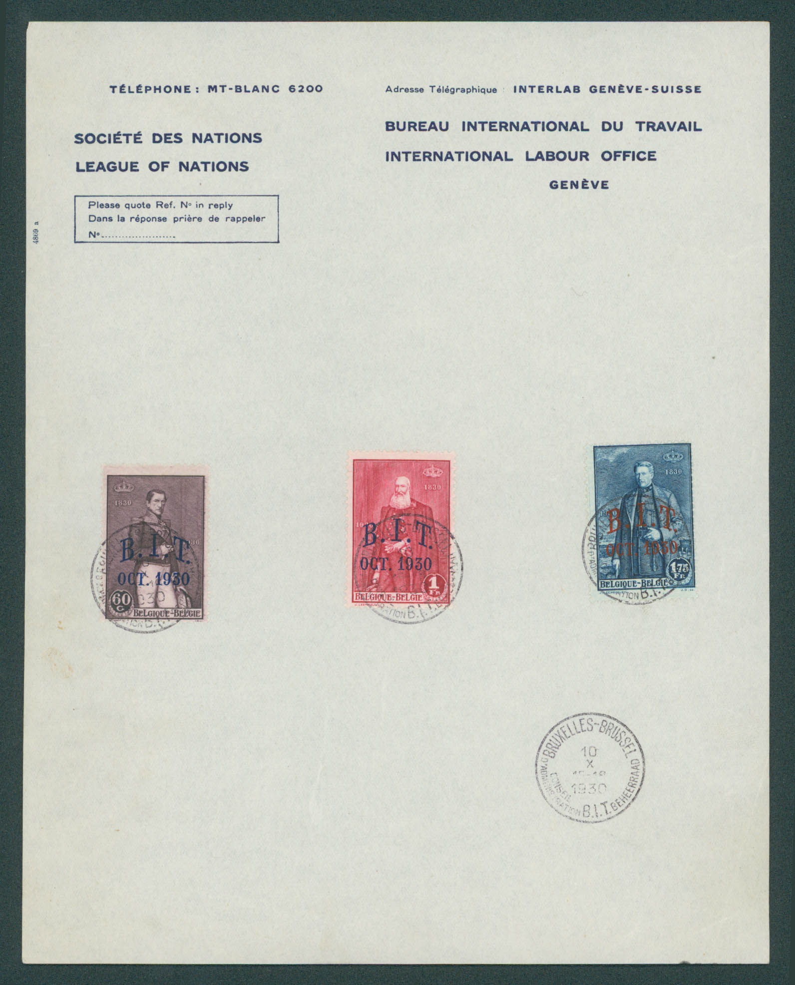 305/7 obl Bruxelles 10/X/1930 sur feuille officielle Société des Nations / Bureau Interntional du Travail. Rare.