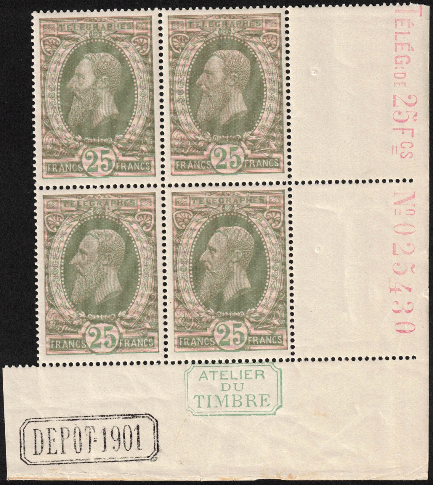 TG 10 en bloc de 4 cdf avec 'Atelier du Timbre', 'Depot 1901' et chiffres en marge. TB'
