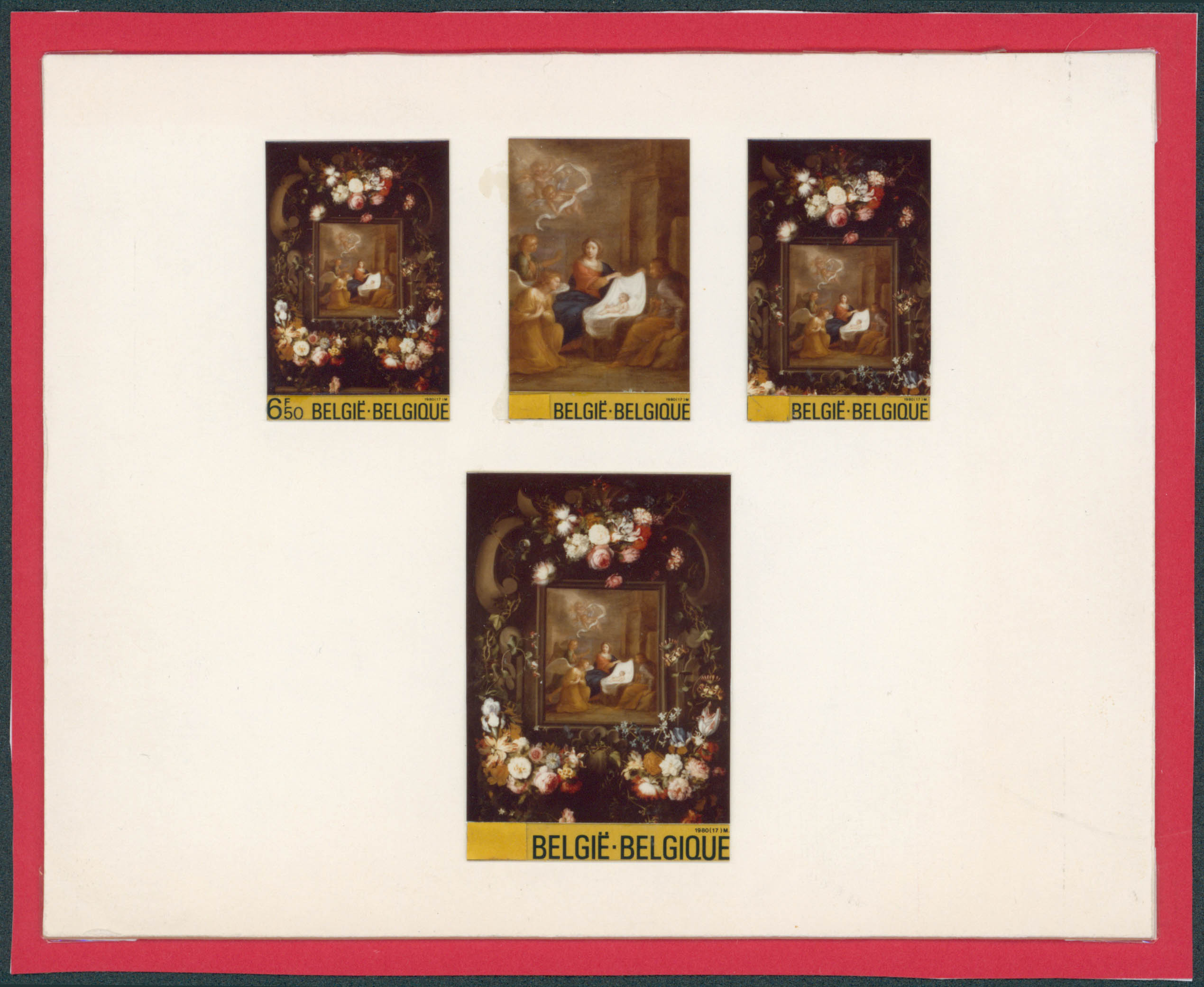 Timbre de Noël - Maquettes réalisées par les Ets Malvaux des 3 variantes de présentation et la variante plus grande qui finalement a été retenue. Le sujet central, la Nativité, était jugé trop petit sur la 1ere et la 3ème variante. Sur la 2ème variante la présentation ne respectait plus l'oeuvre de l'artiste. L'Administration porta sur choix sur la 4ème variante plus grande en accord avec Malvaux. Superbe et unique !!