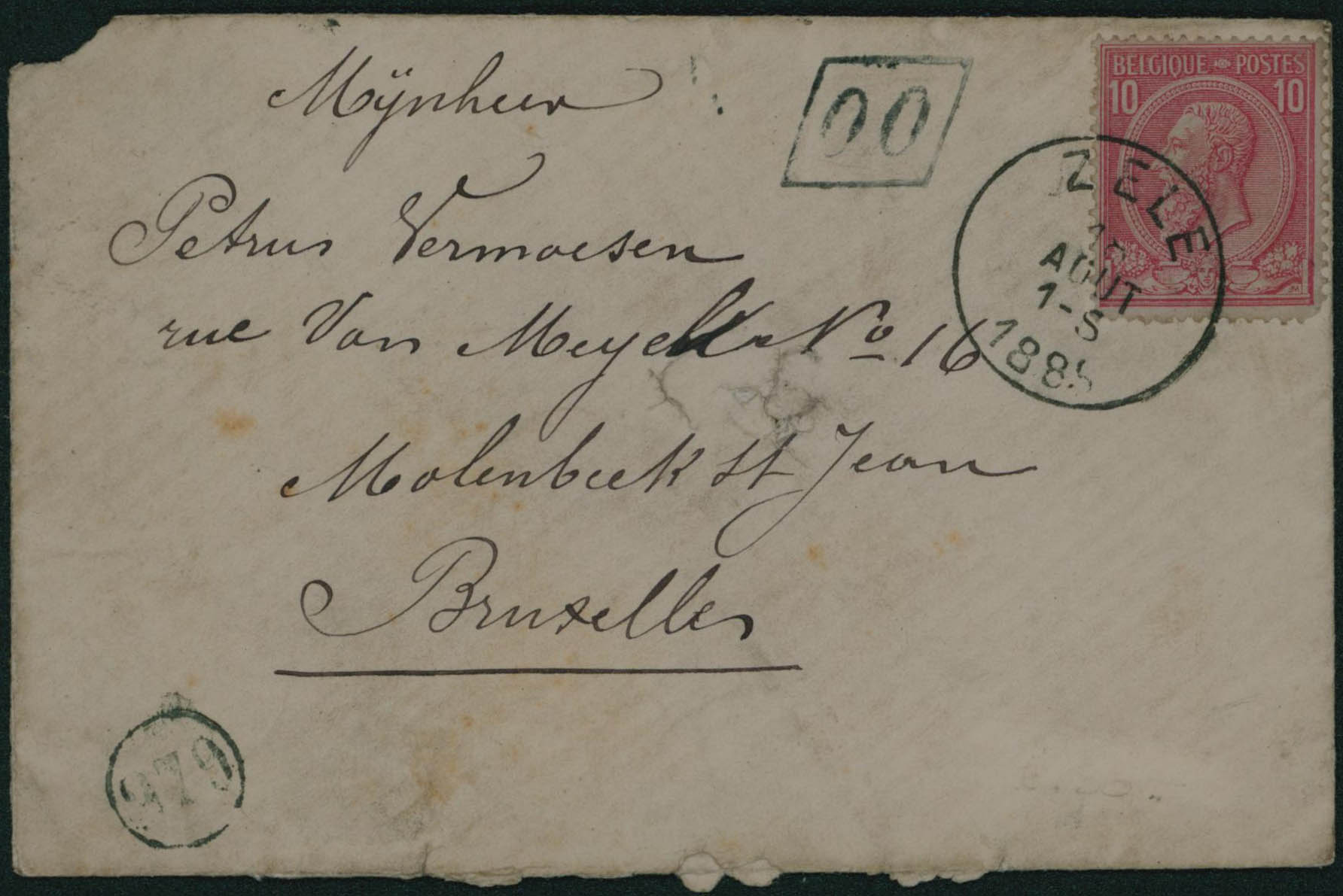46 obl sc Zele 18/8/1885, boite OO, petite enveloppe vers Bruxelles, càd verso 18/8.