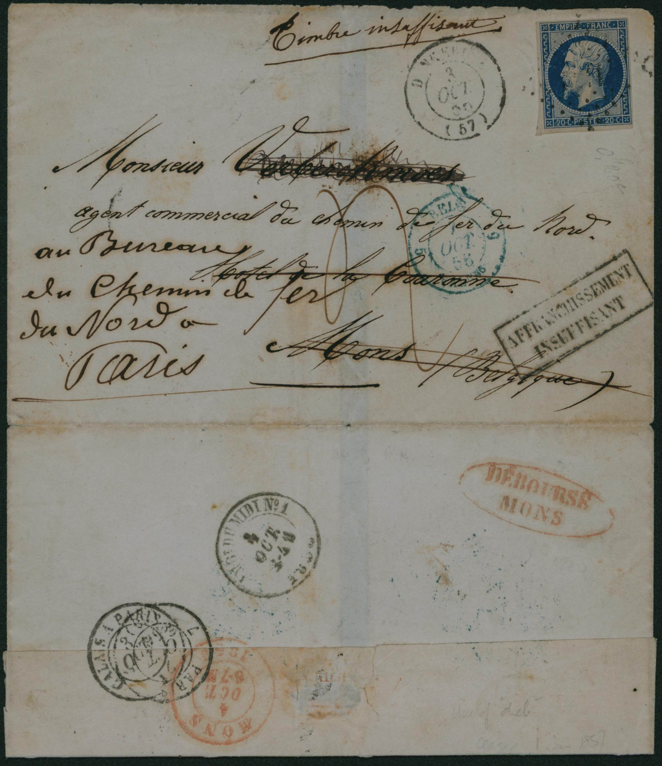 France Yv. 14 de Dunkerque 3/10 vers Mons, càd verso 4/10. Manuscrit 'Timbre insuffisant' et griffe encadrée 'Affranchissement/Insuffisant'. Au verso en rouge 'Déboursé Mons' et suivi Paris.'