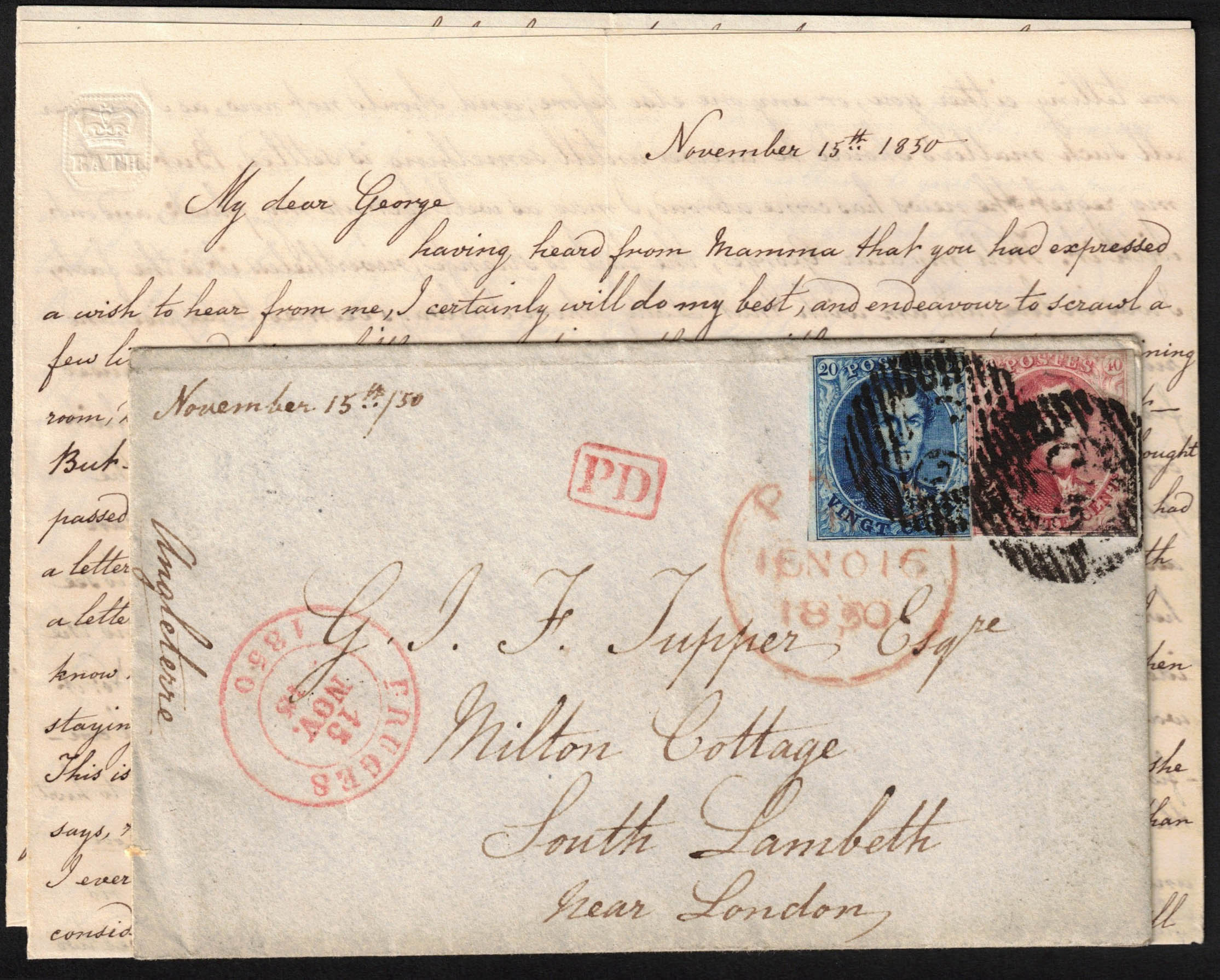 4+5 obl P 23 + càd Bruges 15/11/1850 + PD sur env + contenu vers Londres, càd 16/11.