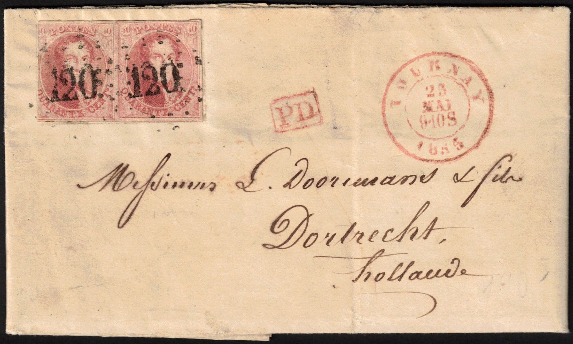 8 en paire, 1 timbre au filet, obl à points P 120 + càd Tournai 23/5/1855 sur LAC vers Dordrecht en Hollande.