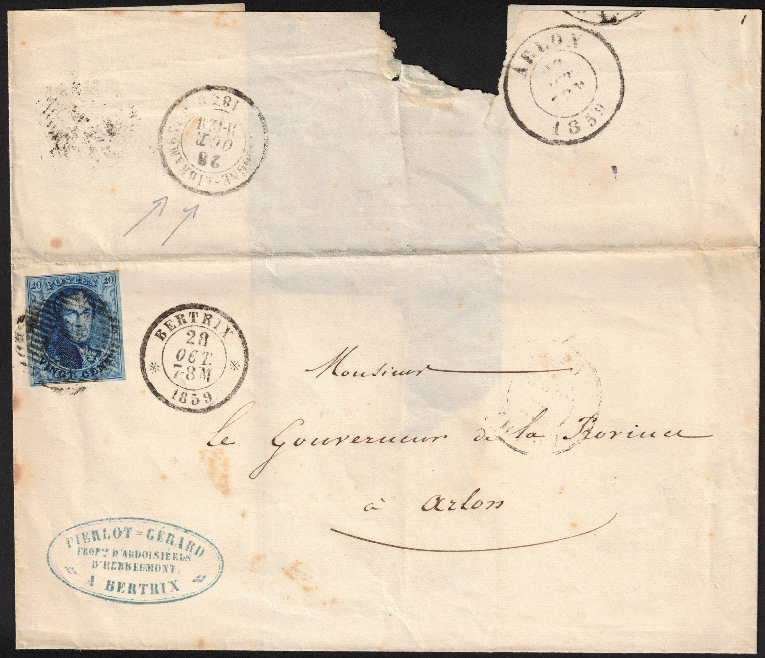 11A obl D 16 + càd Bertrix 28/10/1859, LSC vers Arlon, càd arrivée verso Neufchâteau + cachet ambulant 'Recogne-Libramont'. R.R.'