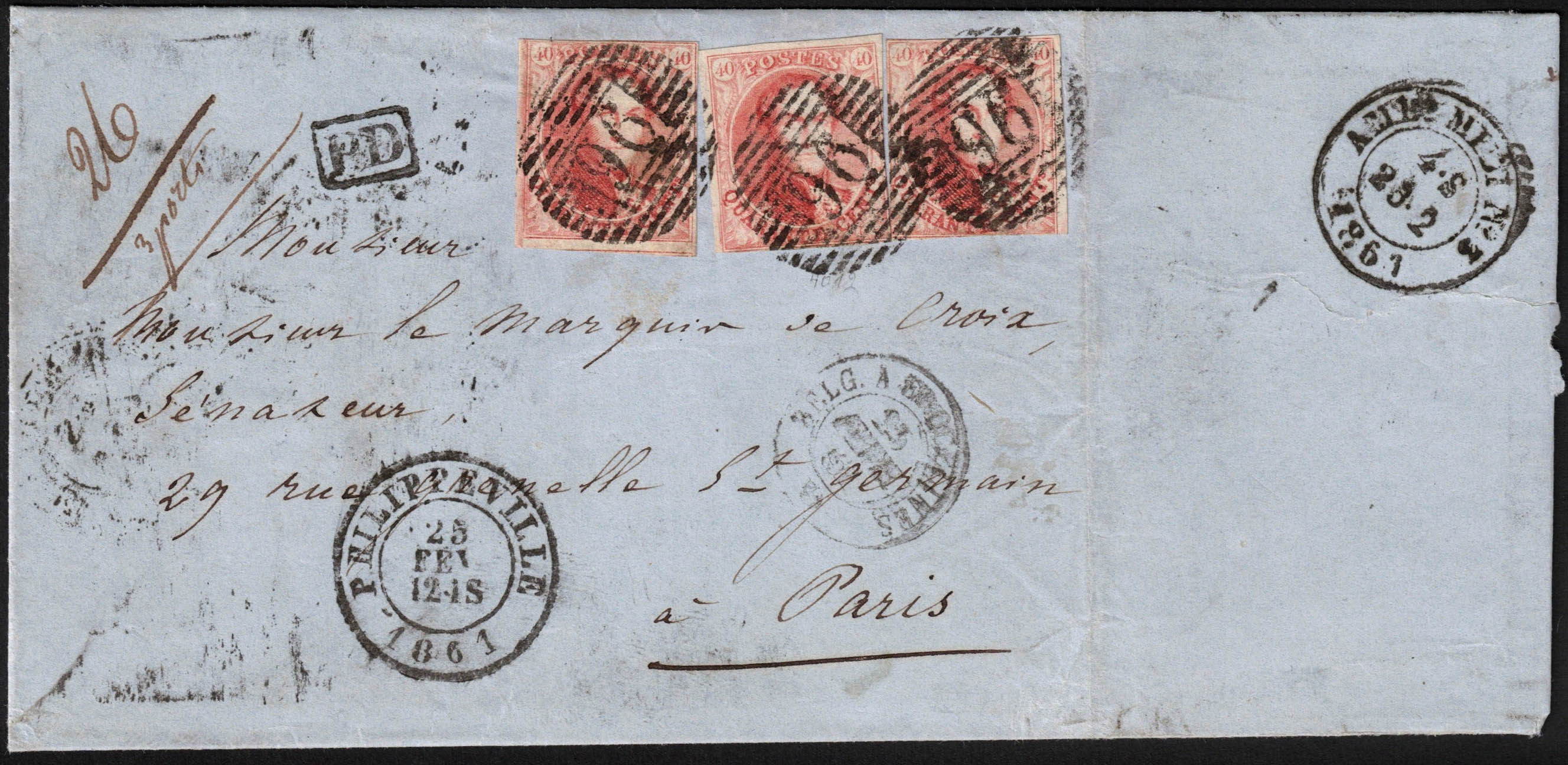 12Ax3 diversement margés obl P 96 + càd Philippeville 25/2/1861 sur LSC vers Paris. 26 grs/ 3 ports. Ambt du Midi N°3 du 25/2 au verso.