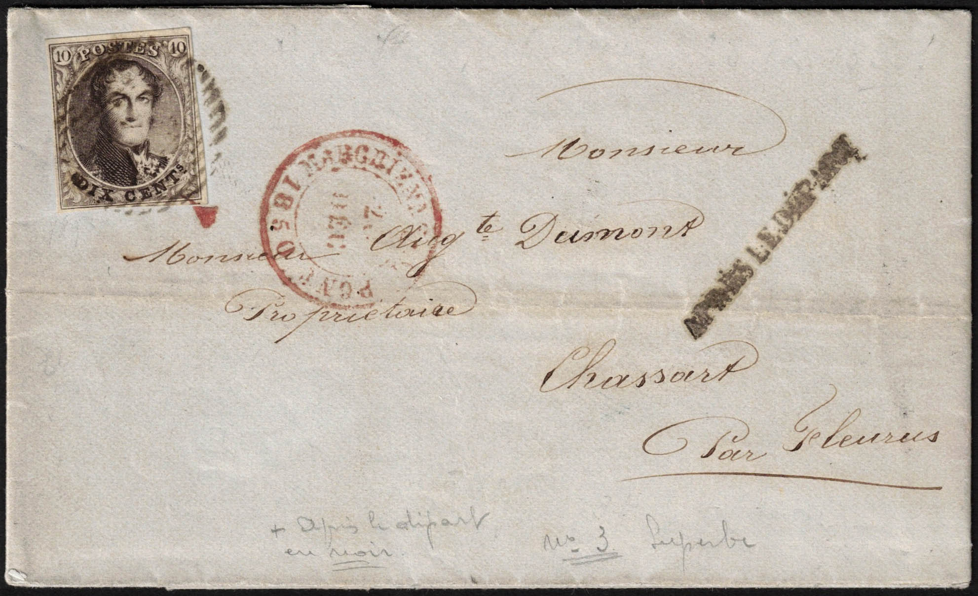 3 margé obl P 80 + càd Marchienne-au-Pont 28/12/1850, petite griffe en noir 'Après le départ' sur LAC vers Chassart.'