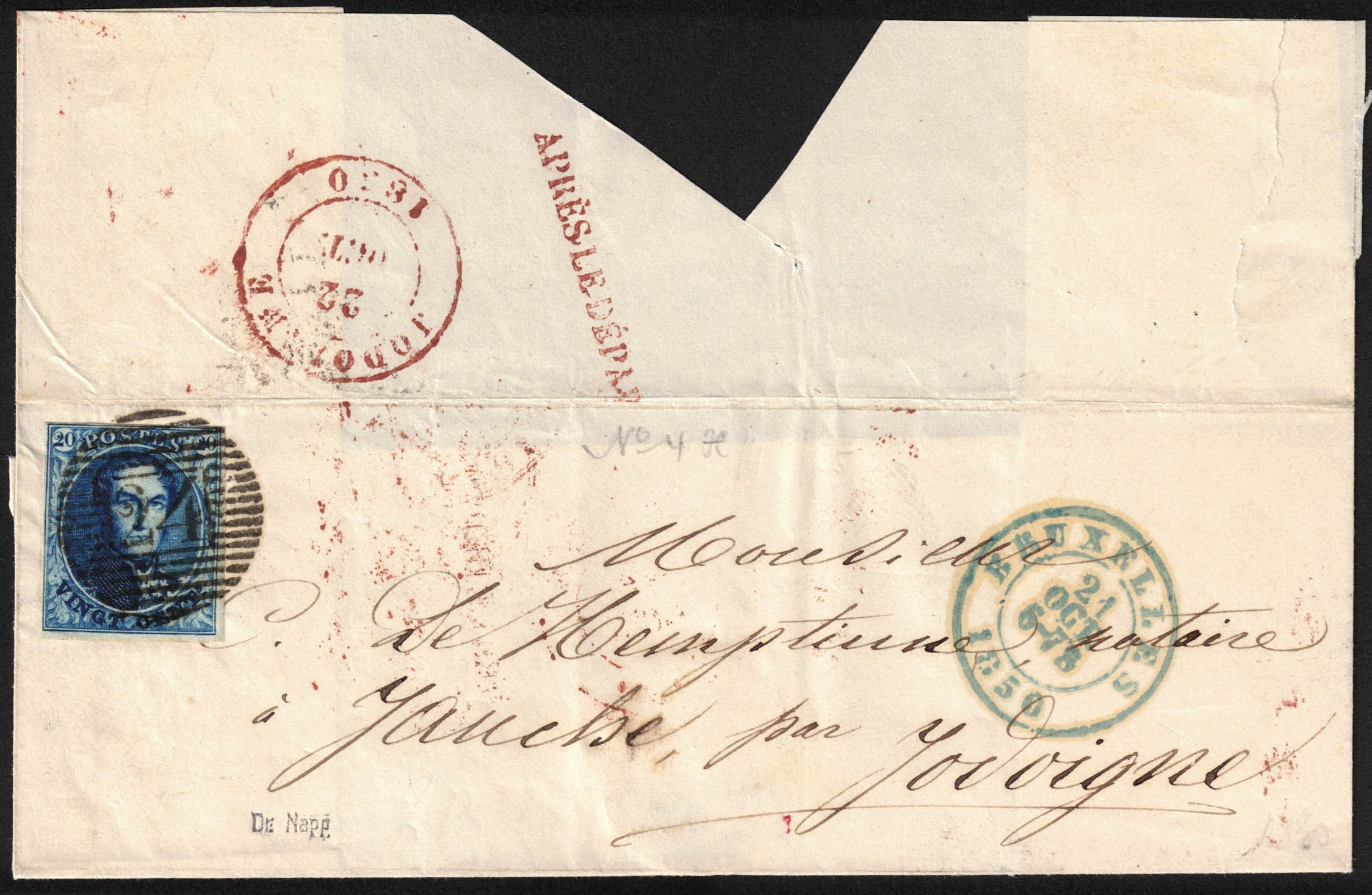 4 margé obl P 24 + càd Bruxelles 21/10/1850, griffe en rouge au verso 'Après le départ' sur LSC vers Jodoigne, càd verso 22/10.'