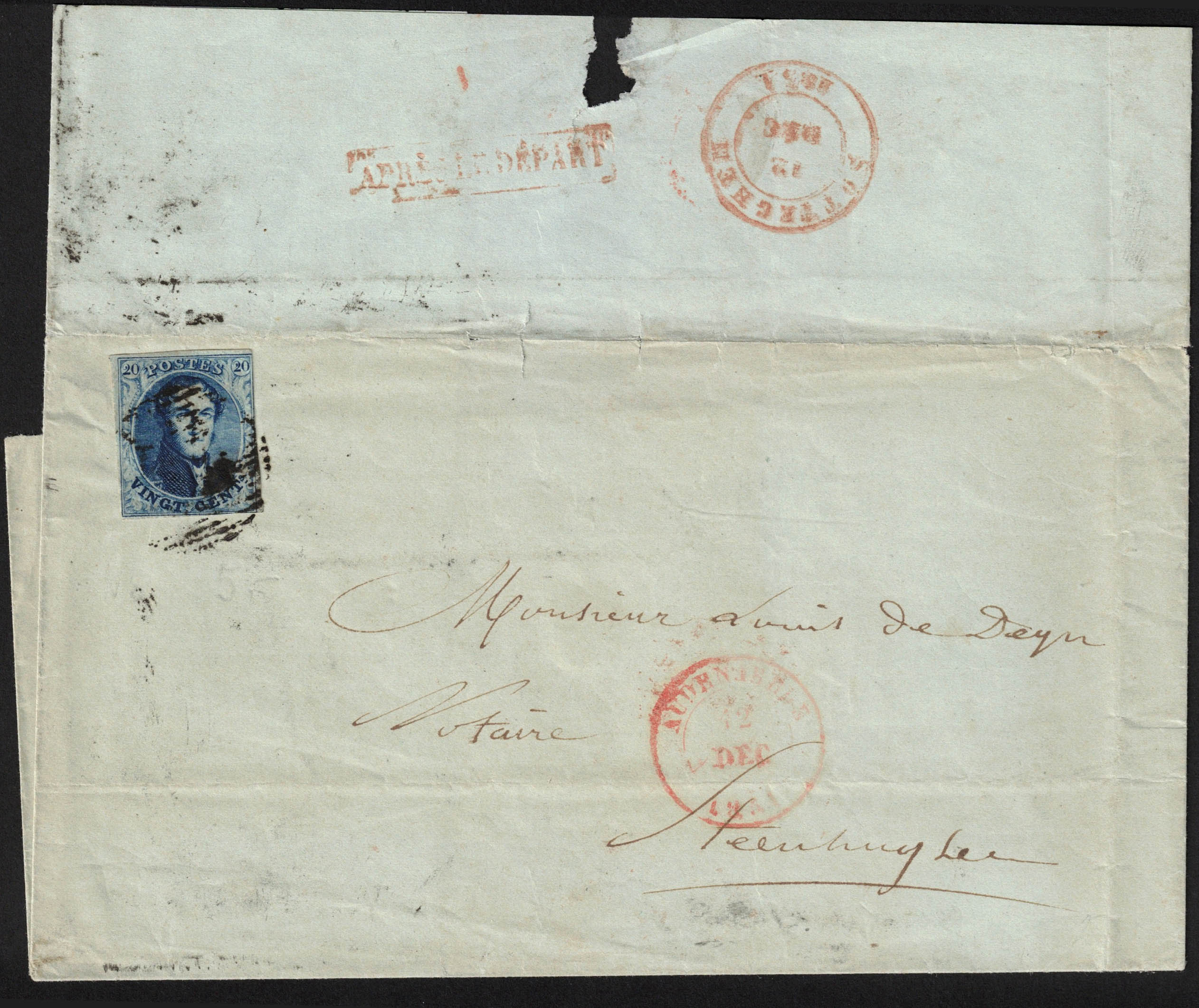 7 margé obl P 9 + càd Audenaerde 12/12/1851, griffe encadrée en rouge au verso 'Après le départ' sur LSC vers Steenhuyze, càd Sotteghem 12/12 au verso.'