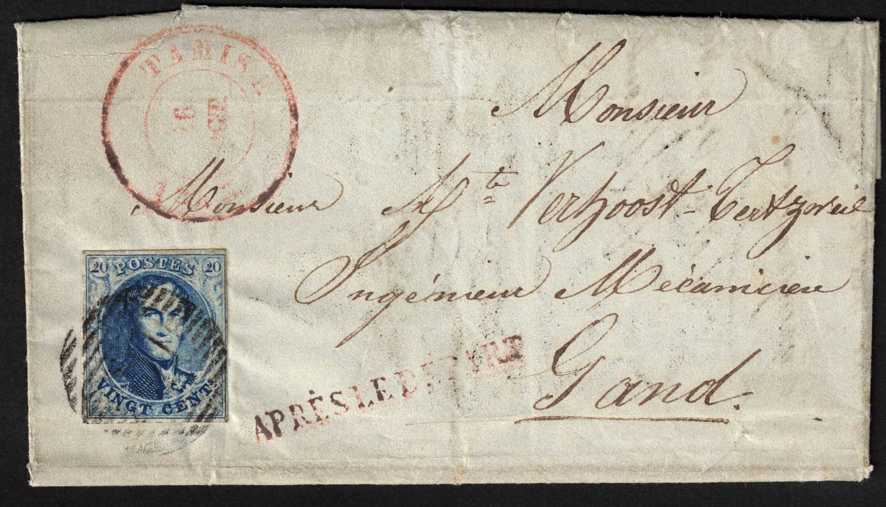 7 au filet obl P 113 + càd Tamise 26/10/1855, griffe 'Après le départ', sur LAC vers Gand, càd verso 27/10.'