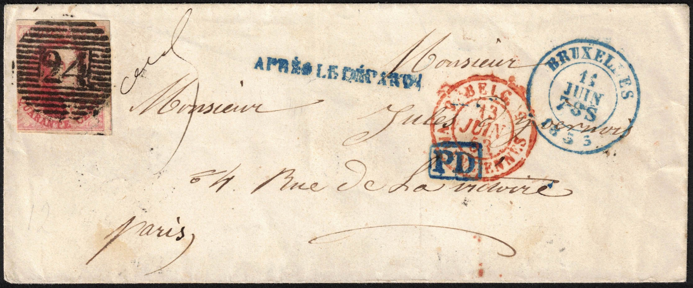 8 au filet coté gauche obl P 24 + càd Bruxelles 11/6/1853, griffe en bleu 'Après le départ' sur enveloppe vers Paris, càd verso 13/6.'