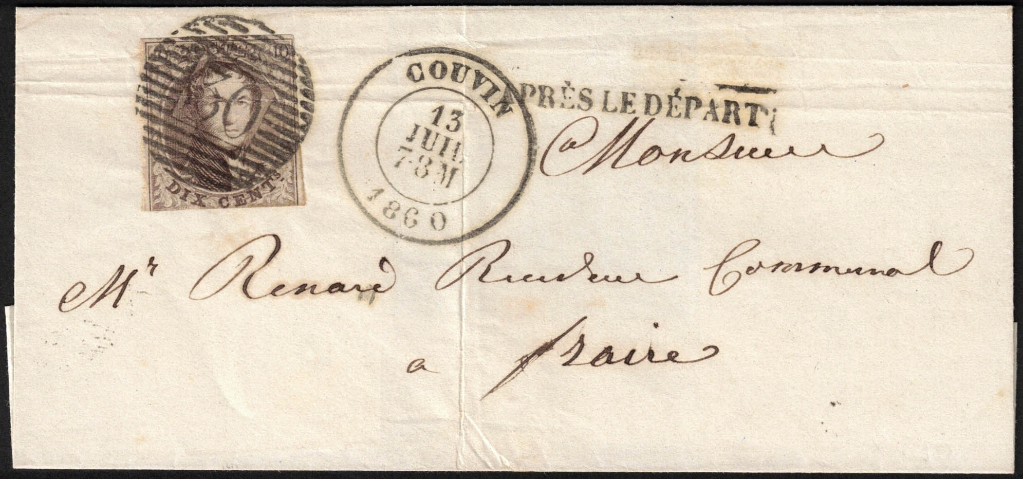 10 touché bord inférieur obl P 30 + càd Couvin 13/7/1860, griffe en noir 'Après le départ' sur LSC vers Fraire, càd Walcourt 13/7 au verso.'