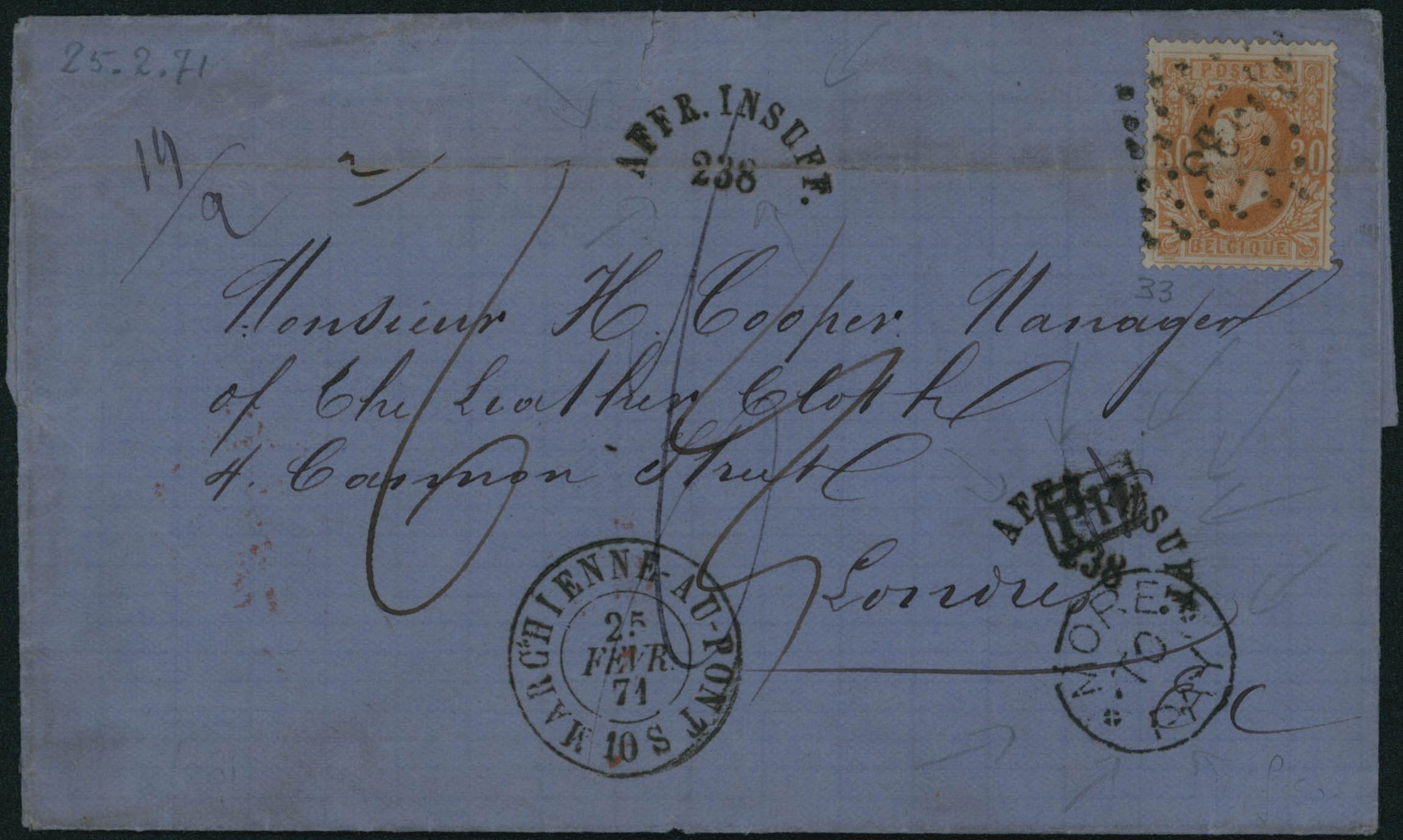 33 (pli d'archives) obl Lpts 238 + càd Marchienne-au-Pont 25/2/71 sur LSC vers Londres. 'Aff. Insuff. 238' frappé 2 fois. 19 grs/2 ports - Angleterre par Ouest I. Taxation anglaise.'