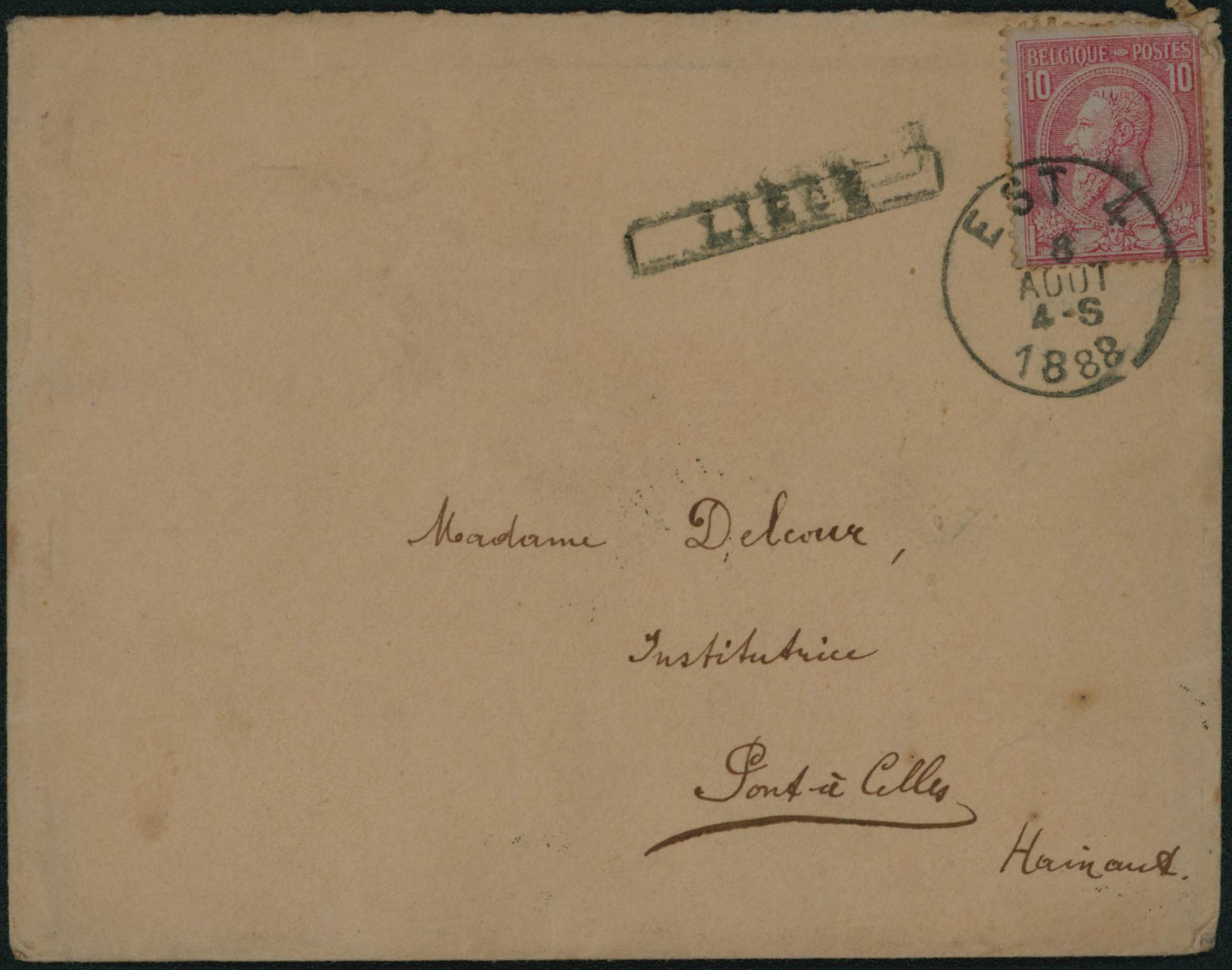 46 obl Est 4 du 8/8/1888, griffe encadrée Liège, vers Pont-à-Celles, càd Luttre 9/8 au verso.