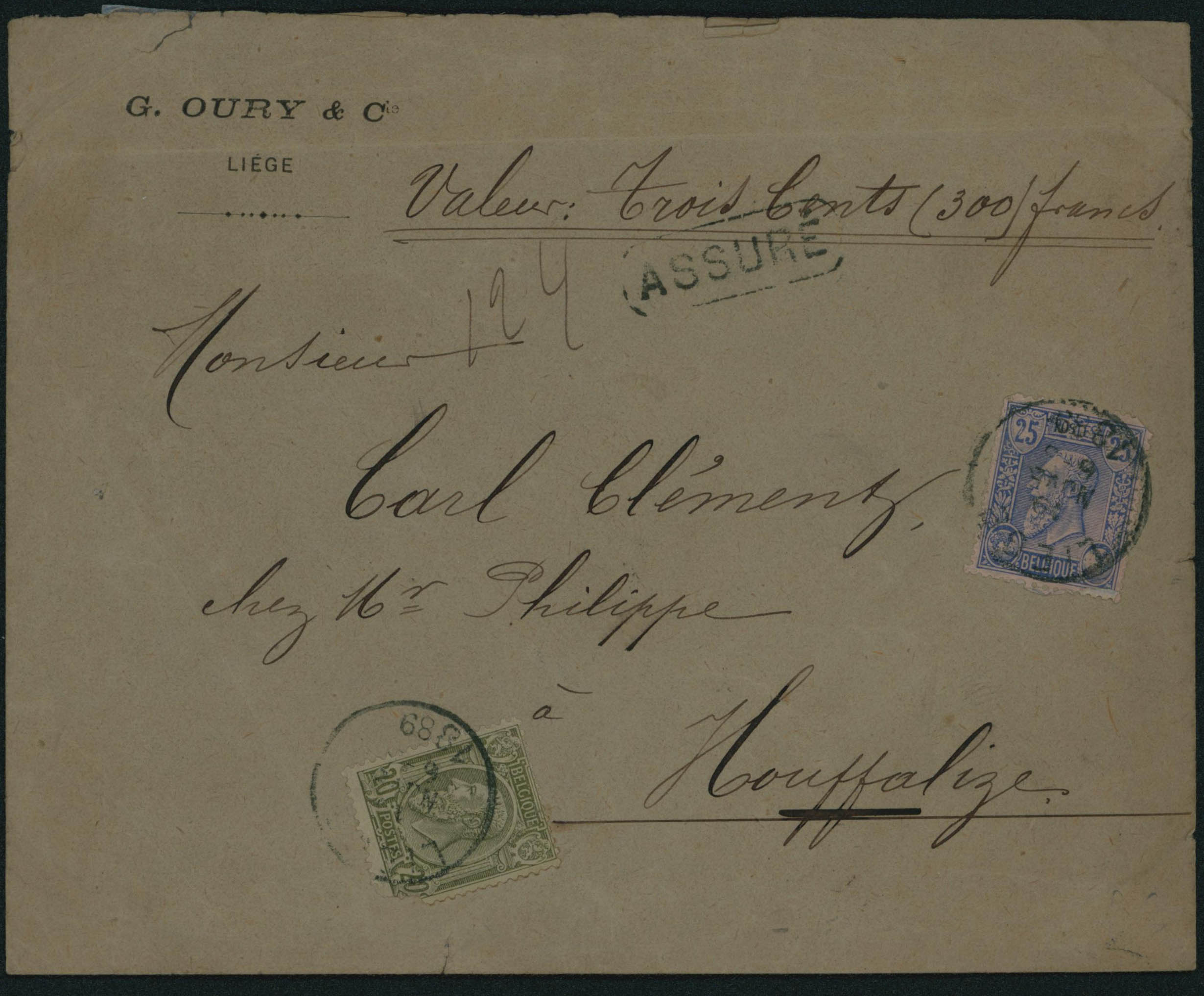 47(déf)-48 obl Liège 19/11/1889 au recto d'un pli assuré (valeur déclarée 300 frs) vers Houffalize. Verso : Liège Guillemins 19/11, Libramont 20/11, arrivée 20/11 + cachets de cire.