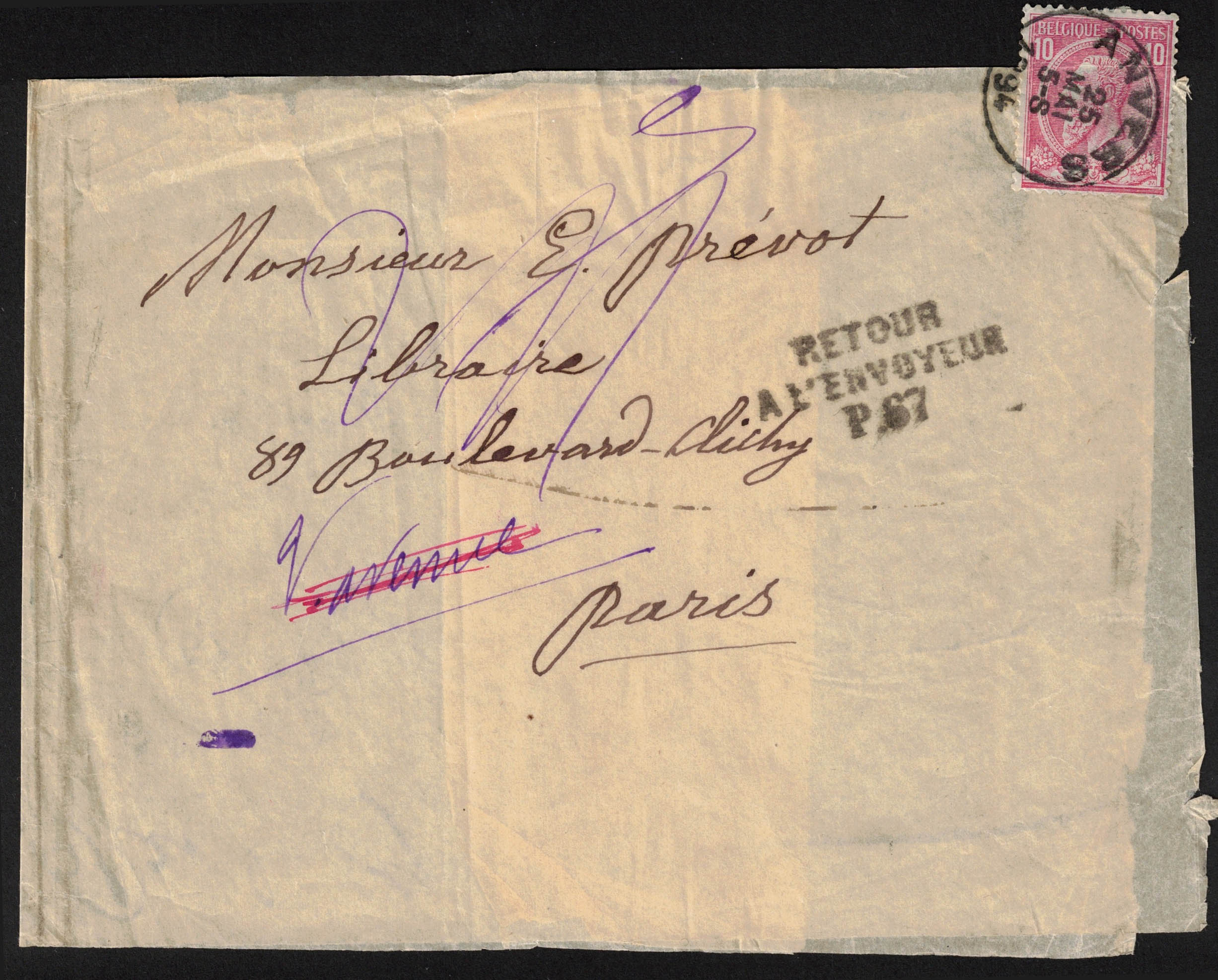 46 obl Anvers 25/5/1894 sur bande d'imprimé (journal) vers Paris. Verso : recherches, inconnu. Retour à l'envoyeur P 67.