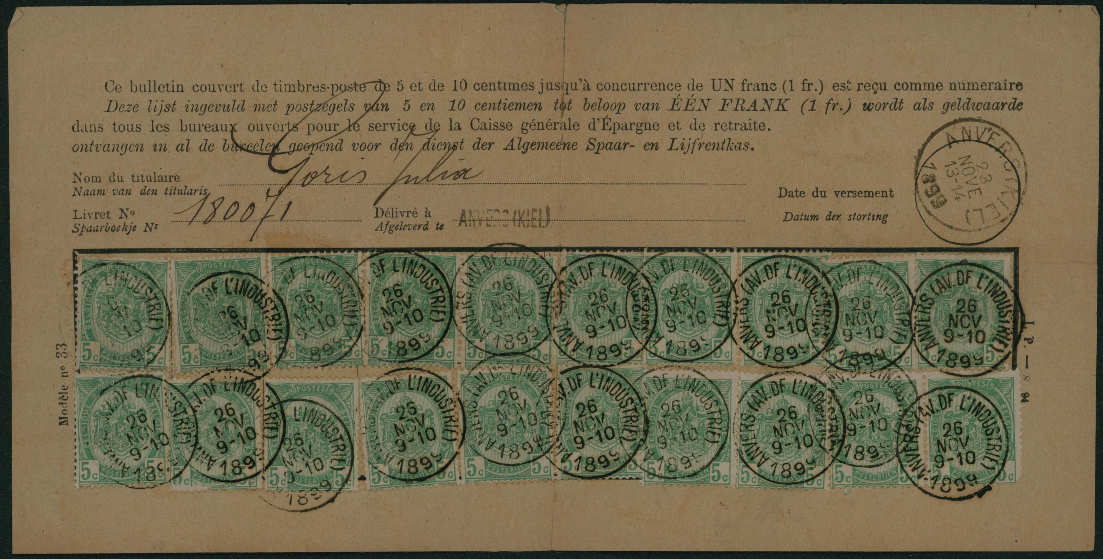56x20 obl sc Anvers(Av de l'Industrie) + sc Anvers(Kiel) sur bulletin d'épargne adulte.