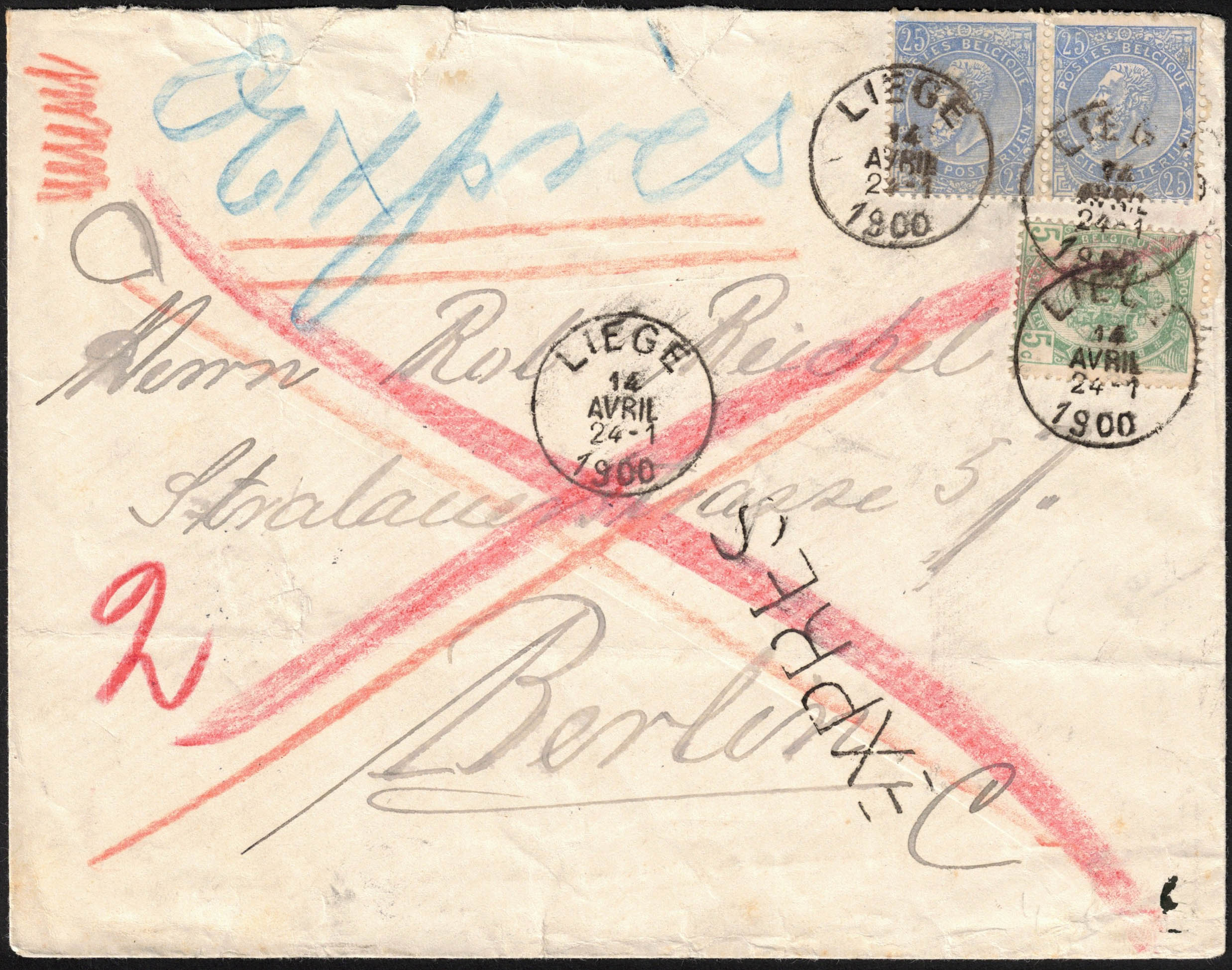 56-60x2 obl sc Liège 14/4/1900 en expres vers Berlin, càd verso. Expres peu courant vers l'étranger.