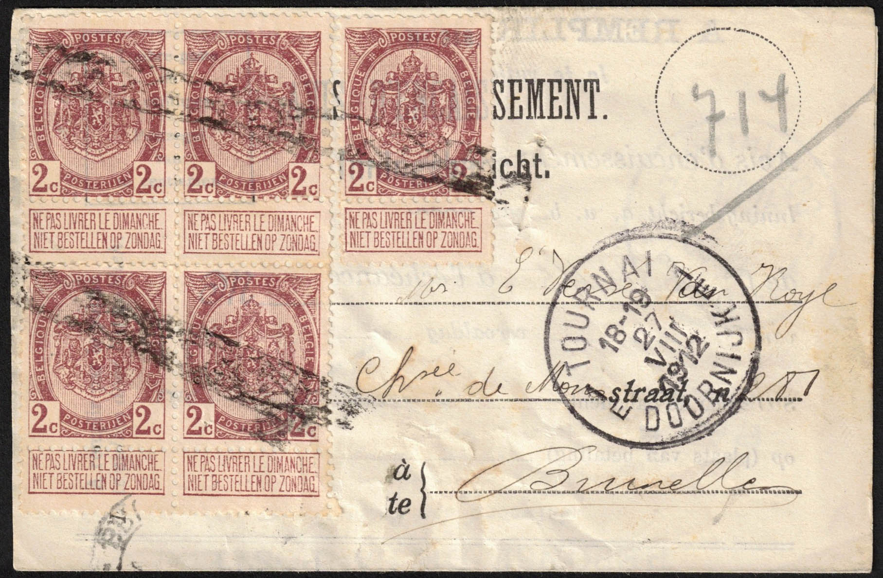 55x3 annulation roulette + càd Tournai 27/8/1912 sur avis d'encaissement d'un effet vers Bruxelles.