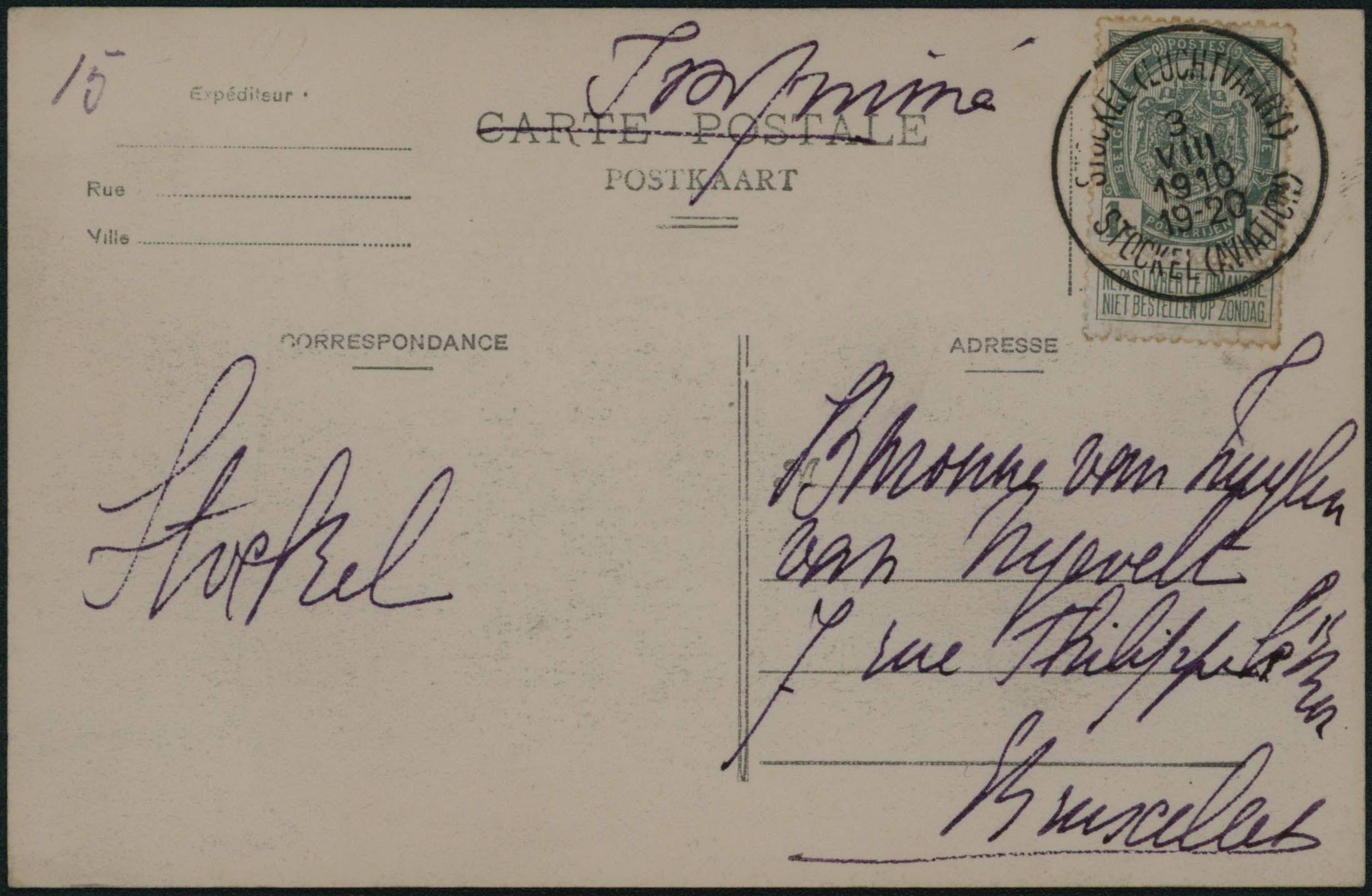 81 obl temporaire Stockel (Aviation) du 3/8/1910 sur CP vers Bruxelles. Verso : Meeting d'aviation. L'aviateur Lauser sur son appareil.