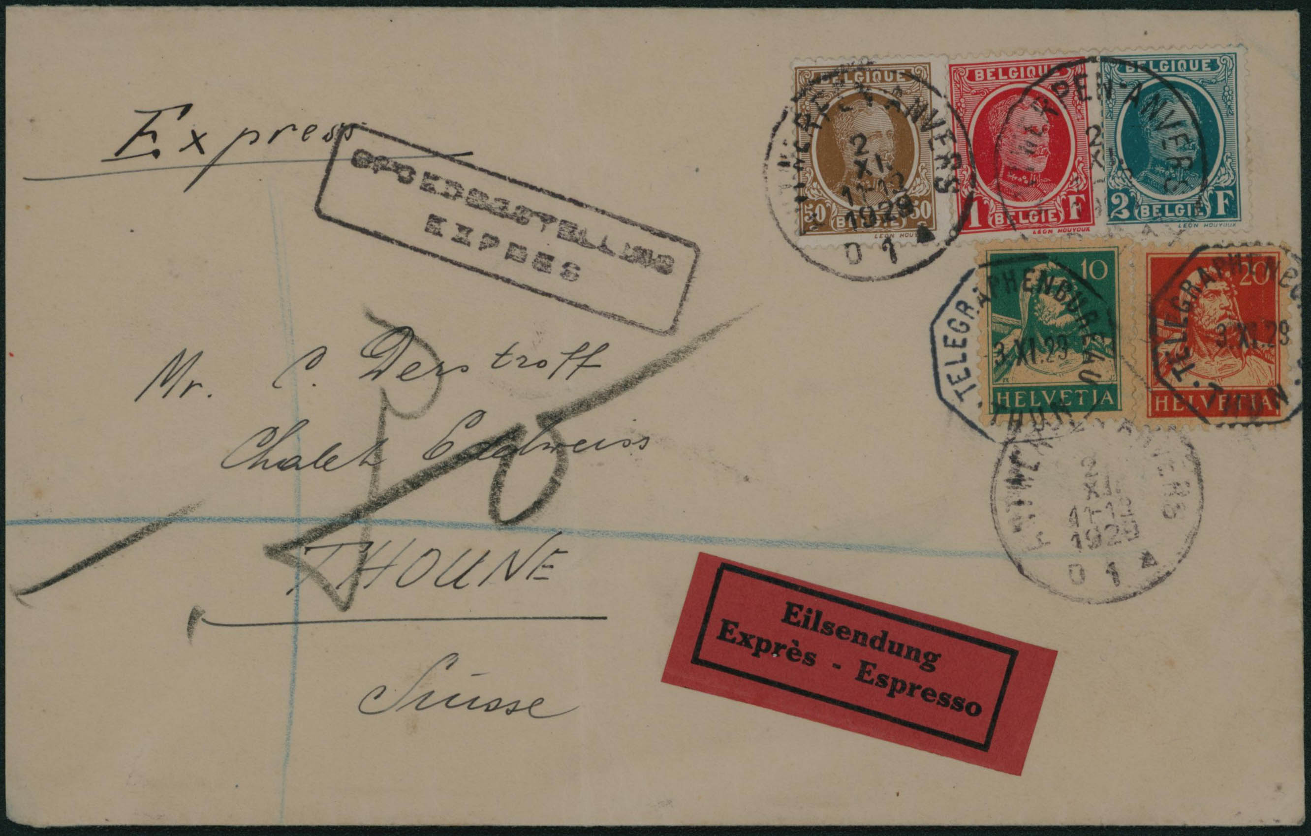 203-208-256 obl Antwerpen 2/XI.1929 en expres vers Thoune en Suisse. Taxe additionnelle 30c obl octogonale Telegraphenbureau Thun. Peu courant !!