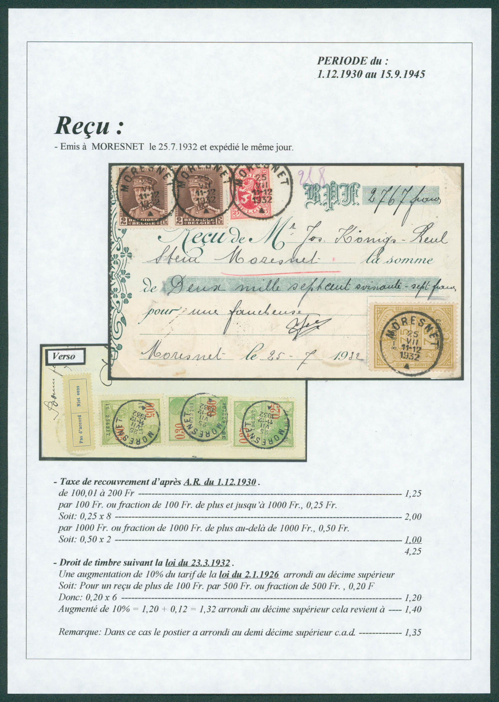 Reçu de 2767 Frs émis à Moresnet le 25/7/1932 vers la ville. Taxe de recouvrement 4,25 F par 282-321x2 + droit de timbre 1,35 F (fiscaux 75c + verso 0,05-0,25 et 0,70). TB.