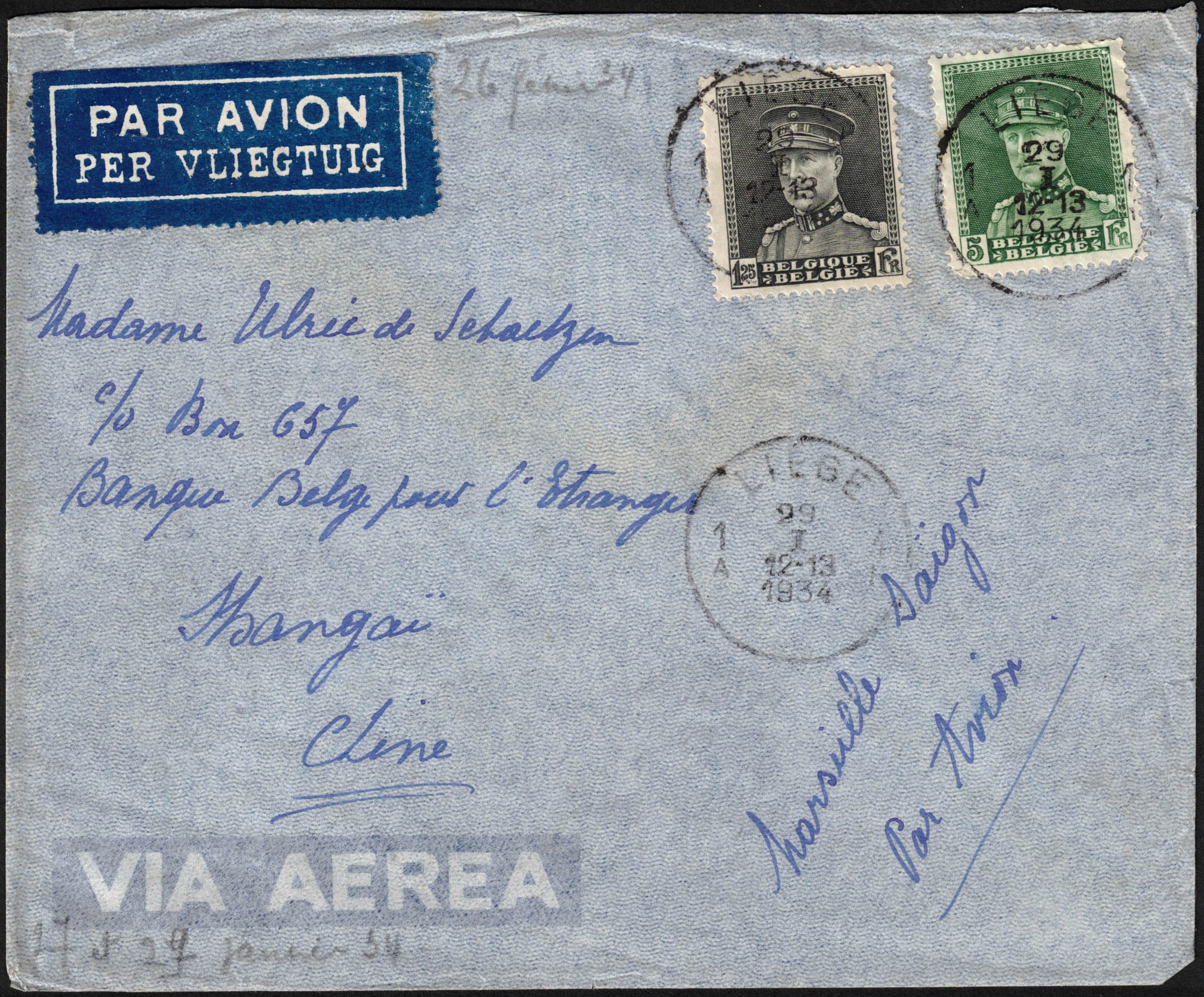318-323 obl sc Liège 1 du 29/1/34 en PA via Marseille vers Shanghaï en Chine.