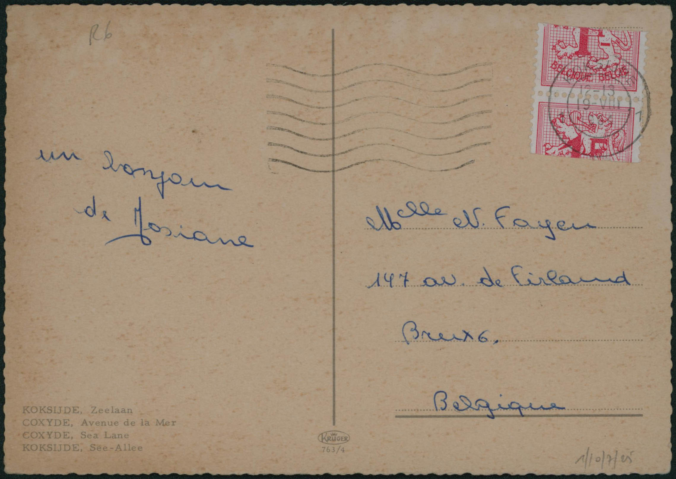 R 6 (2 demi-timbres) en paire verticale obl mécanique Koksijde 19/8/64 sur CP vers Bruxelles.