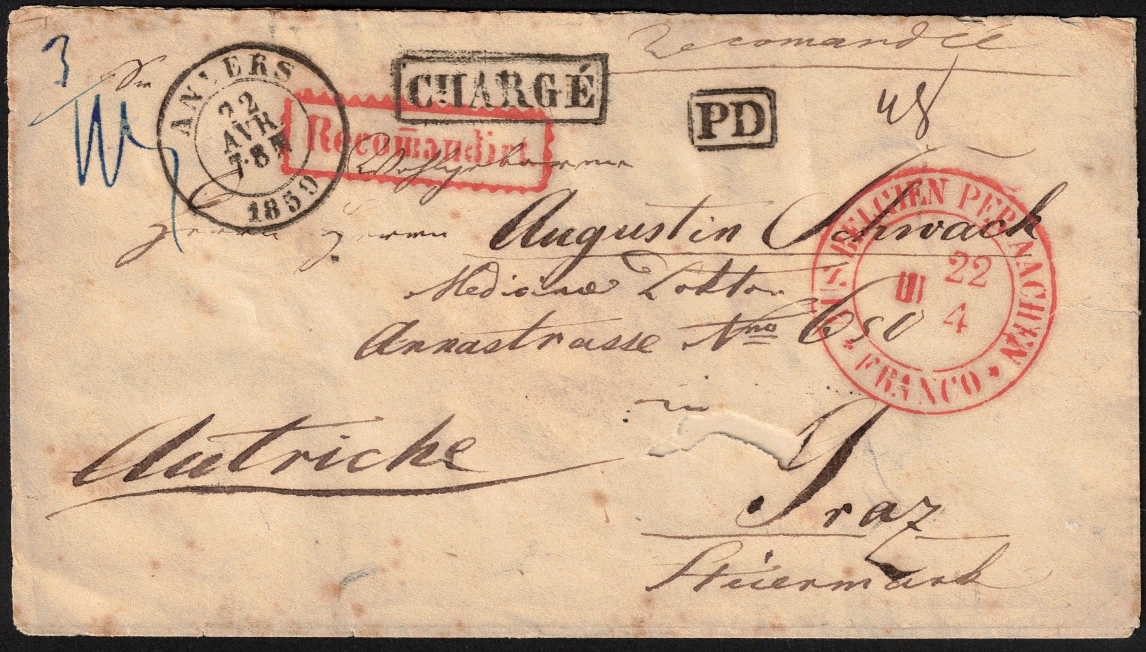 Env d'Anvers 22/4/1859 vers Graz en Autriche, manuscrit 'Recommandé'. Griffes encadrées en noir 'Chargé' et 'PD'. Griffe encadrée en rouge 'Recomandirt'. Càd 'Aus Belgien per Aachen/Franco 22/4'. Port 4 décimes pour l'Autriche = 3 gros d'argent répété au verso par Aix comme '3/wg' (3 weiterfranco). 8 décimes à payer par l'expéditeur. Le port ordinaire se compose de 4d (pour la Prusse) + 2d (2ème rayon) = 6. TB'