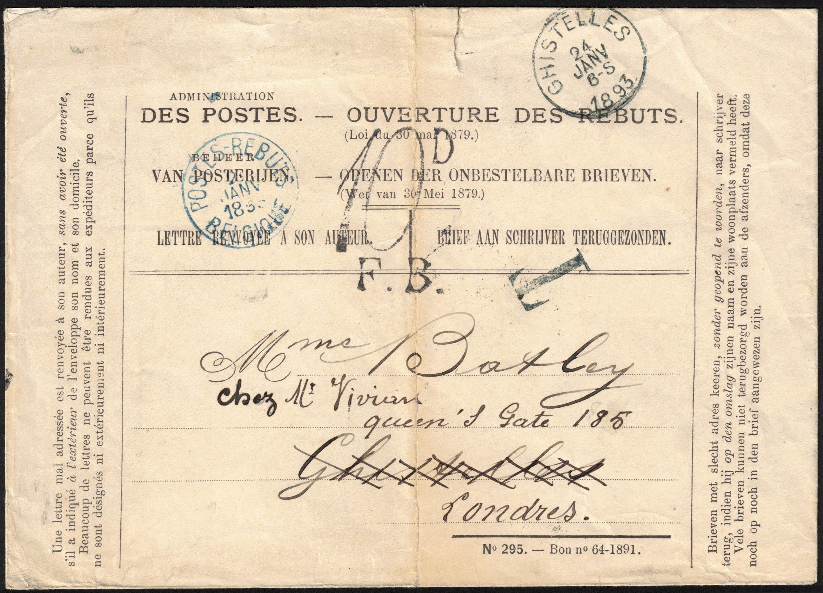 Env de l'Adm. Postes - Ouverture des Rebuts - vers Ghistelles, càd arrivée 24/1/1893. Suivi vers Londres. T 10d. Càd South Kensington 25/1.