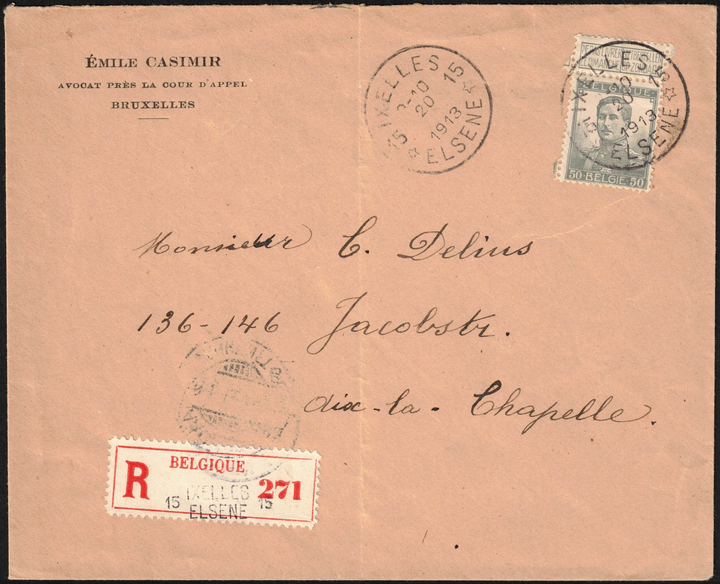 115 obl Agence Ixelles 15 du 20/1/1913 en rec vers Aix-la-Chapelle.