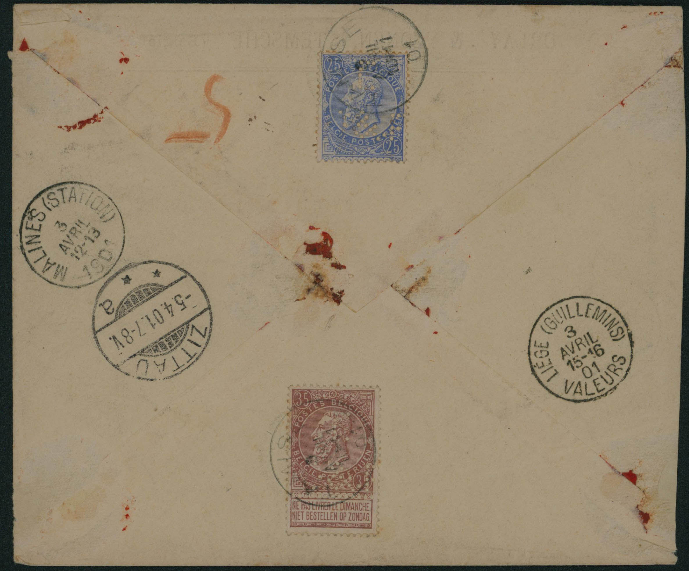 60-61 perforés (Ed. Orlay & Zonen) obl Tamise 3/4/01 via Malines(Station) 3/4 et Liège(Guillemins)/Valeurs 3/4 au verso d'un pli assuré (valeur déclarée 180 Frs) - 12 grs/1 port - vers Zittau, Allemagne. Càd arrivée 5/4.