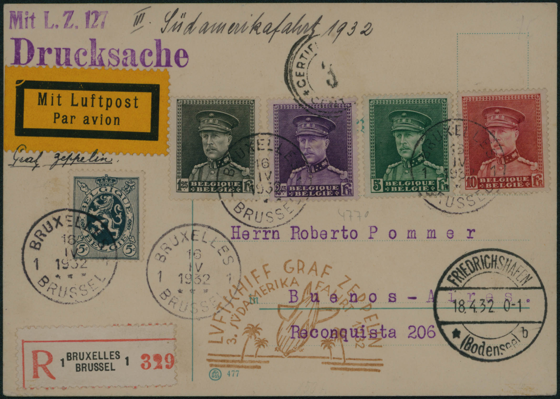 279-318-322/4 obl Bruxelles 16/4/32, Graf Zeppelin LZ 127 3. Südamerikafahrt 1932 via Friedrichshafen 18/4/32 en rec vers Buenos-Aires, Argentine, càd verso 22/4. Rare.