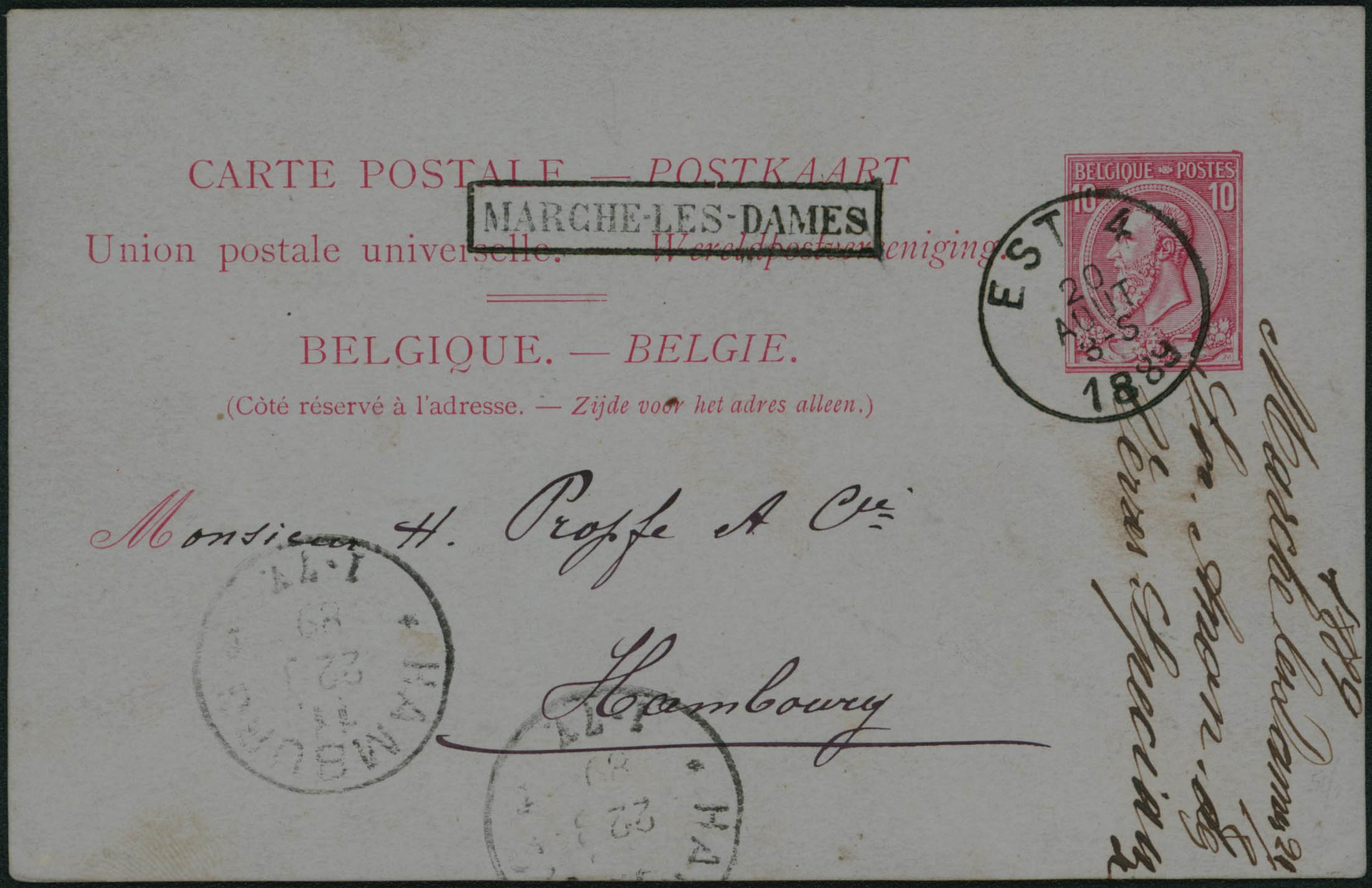 EP 10c (Type N° 46) obl Est 4 du 20/8/1889, griffe encadrée Marche-les-Dames vers Hamburg, Allemagne. Càd arrivée 22/8. Texte au verso.