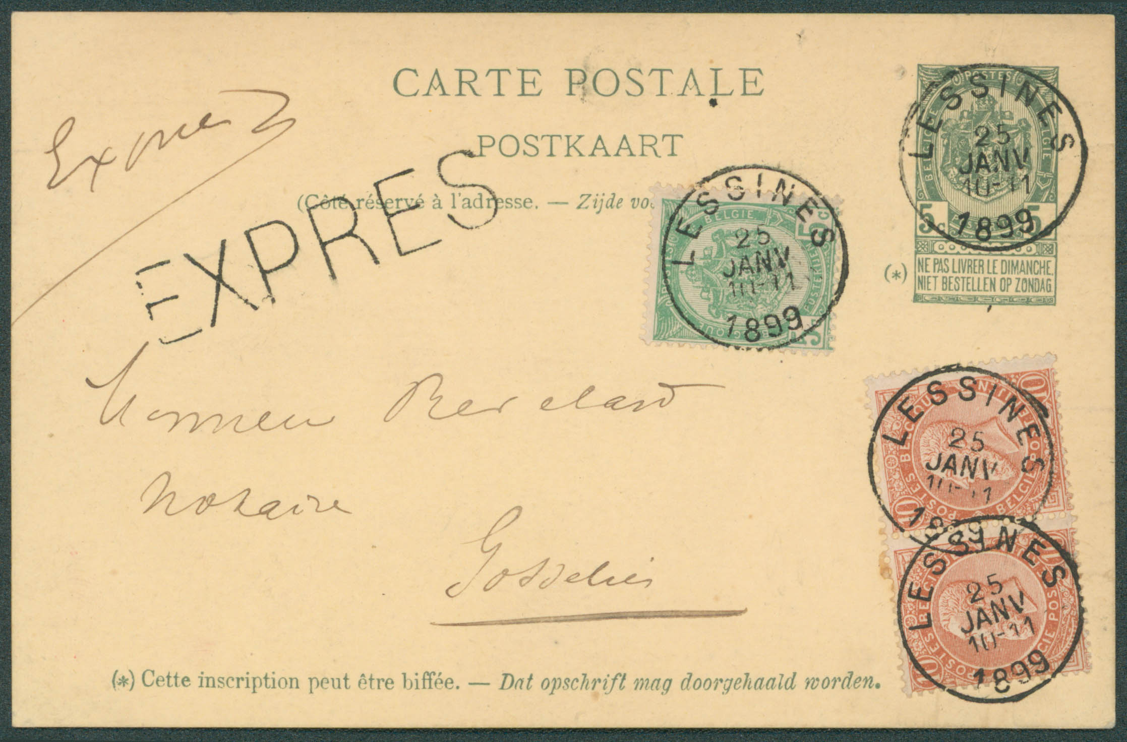 EP 5c + 56-57x2 obl Lessines 25/1/1899 en expres vers Gosselies. Texte au verso.