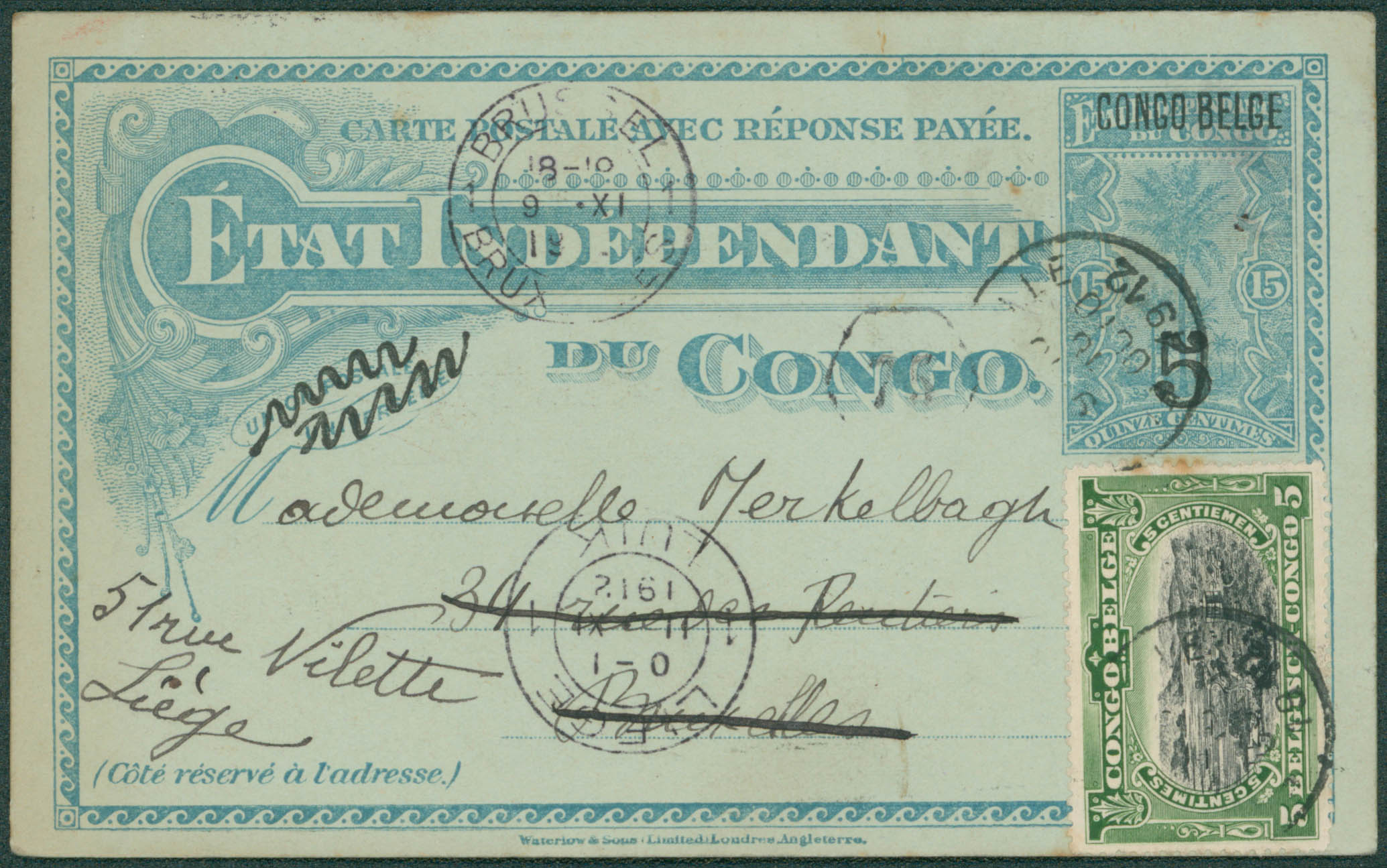 EP 5c (N°31) double, voyagé aller + 54 obl Léopoldville vers Bruxelles, càd arrivée et suivi Liège. Texte au verso.