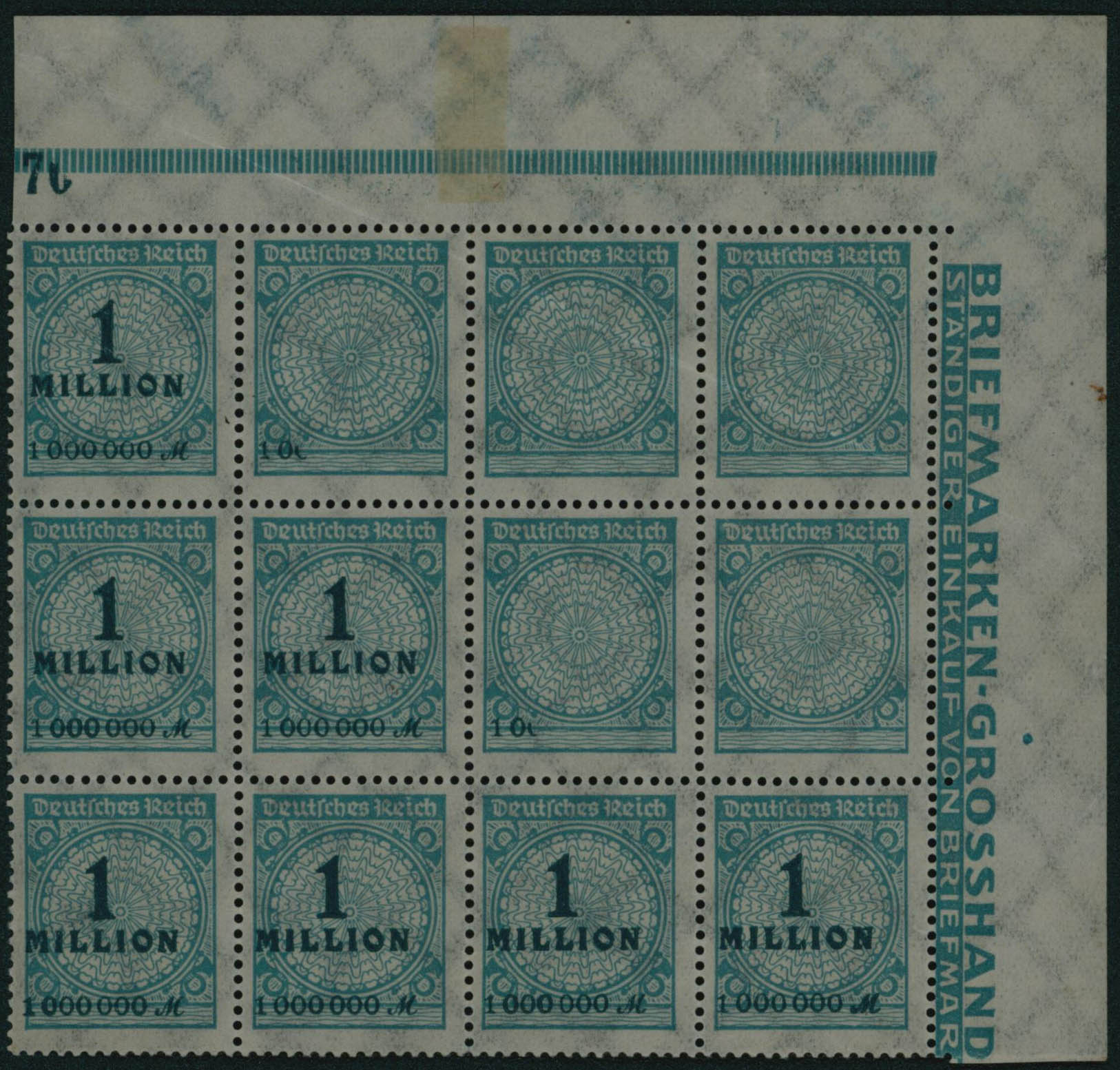 Mi 314 PF en bloc de 12 XX, 3 timbres sans surcharge, 2 avec partie de surcharge, partie de la surcharge au verso (pli pendant le processus d'impression). Spectaculaire. Certificat photo Dr. Helmut P. Oechsner.