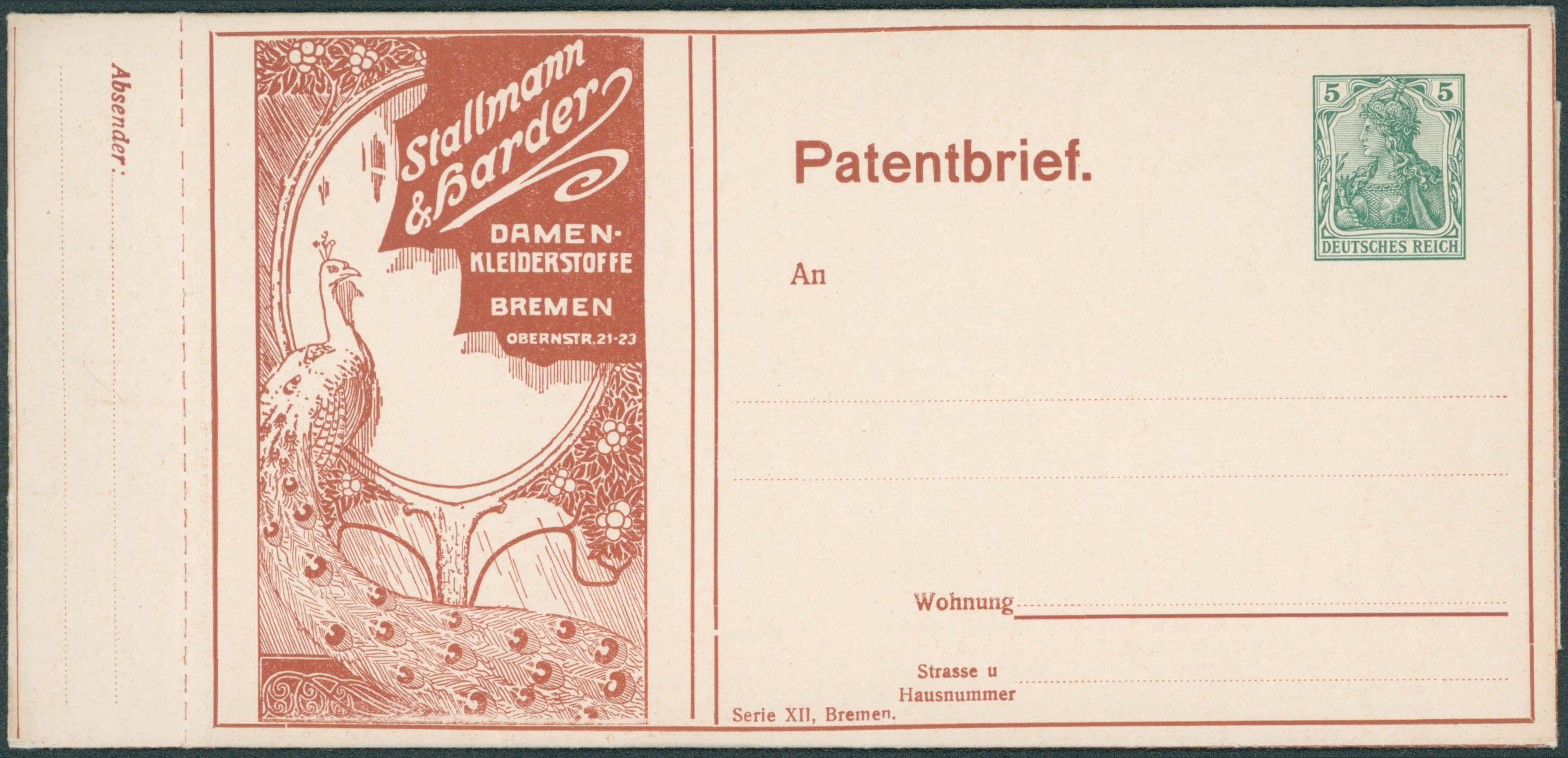 Patenbrief, EP neuf 5c, série XII Bremen, dépliant publicitaire illustré, thèmes divers dont navire, paon, chapeau? Superbe état.