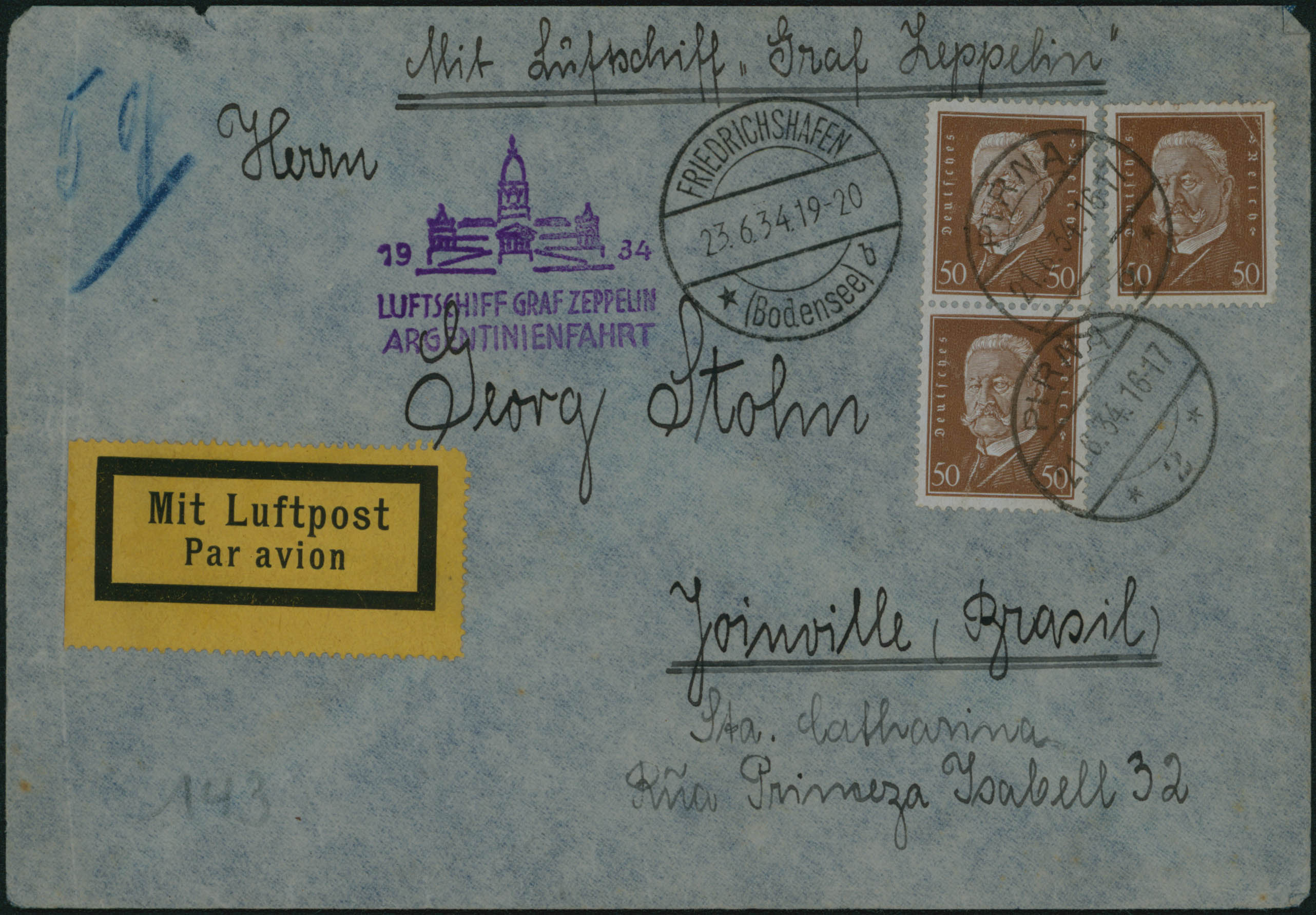Yv. 411x3 obl Pirna 21/6/34 via Friedrichshafen 23/6, Graf Zeppelin Argentinienfahrt 1934 vers Joinville, Brésil. Verso Condor Zeppelin Lufthansa et càd arrivée 30/6.