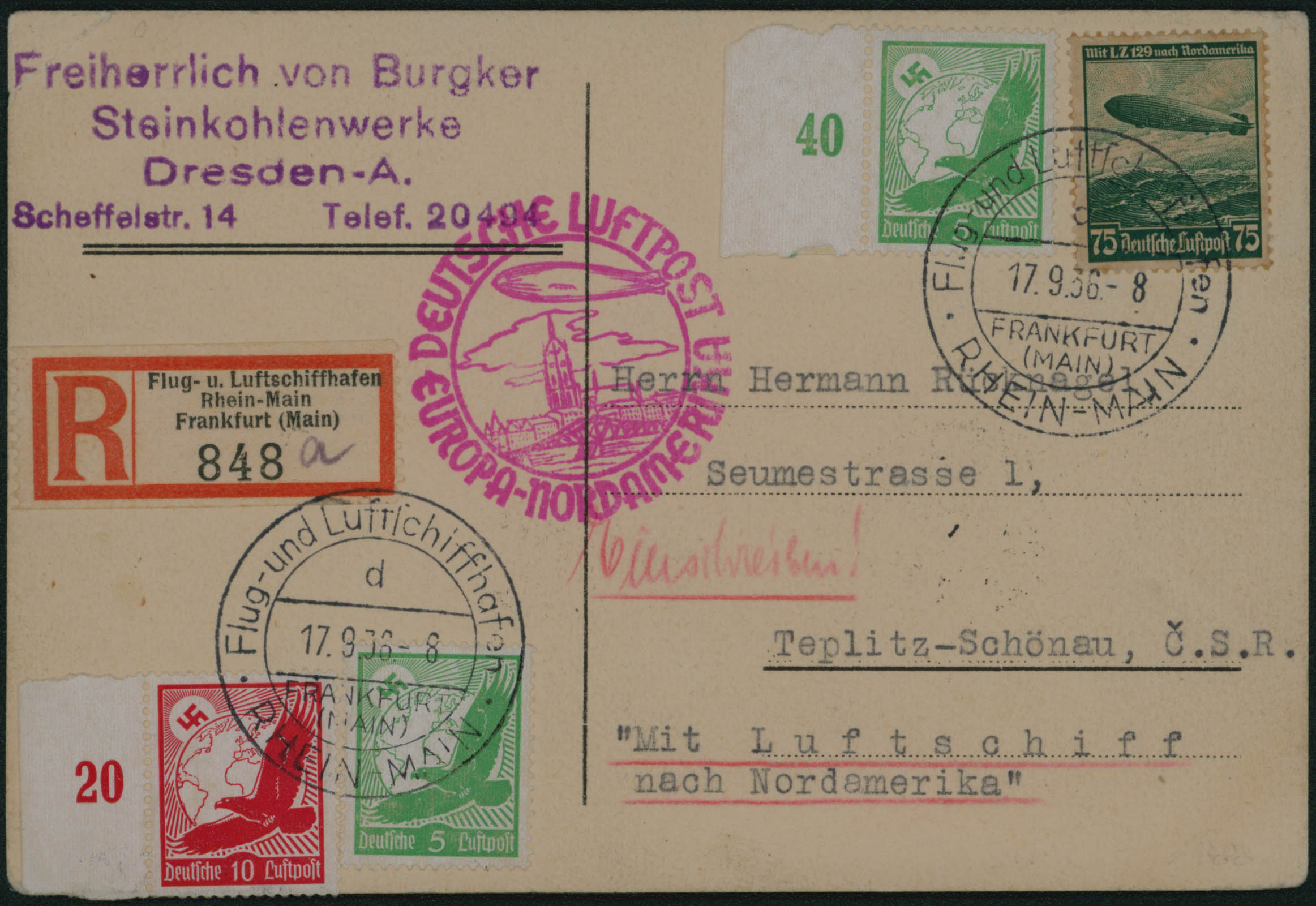 Yv. PA 43x2-44-56 obl Frankfurt 17/9/36, cachet illustré Deutsche Luftpost/Europa Nordamerika en rec vers Teplitz-Schönau. Au verso càd New-York 20/9/36, Prague 30/9 + texte. TB