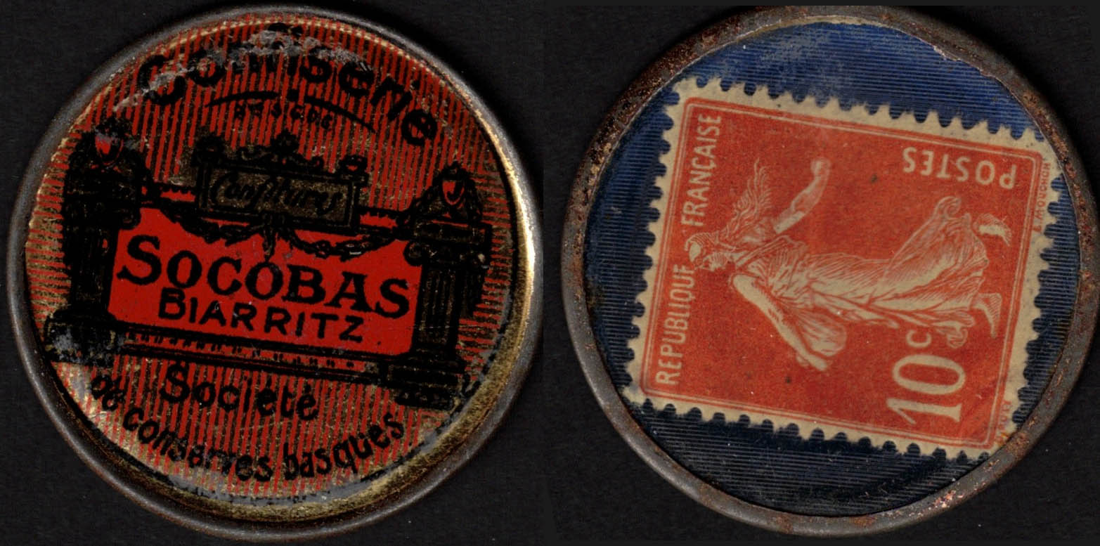 Timbre monnaie - Yv. 138 - Publicité au verso 'Confiserie Socobas/Biarritz'.'