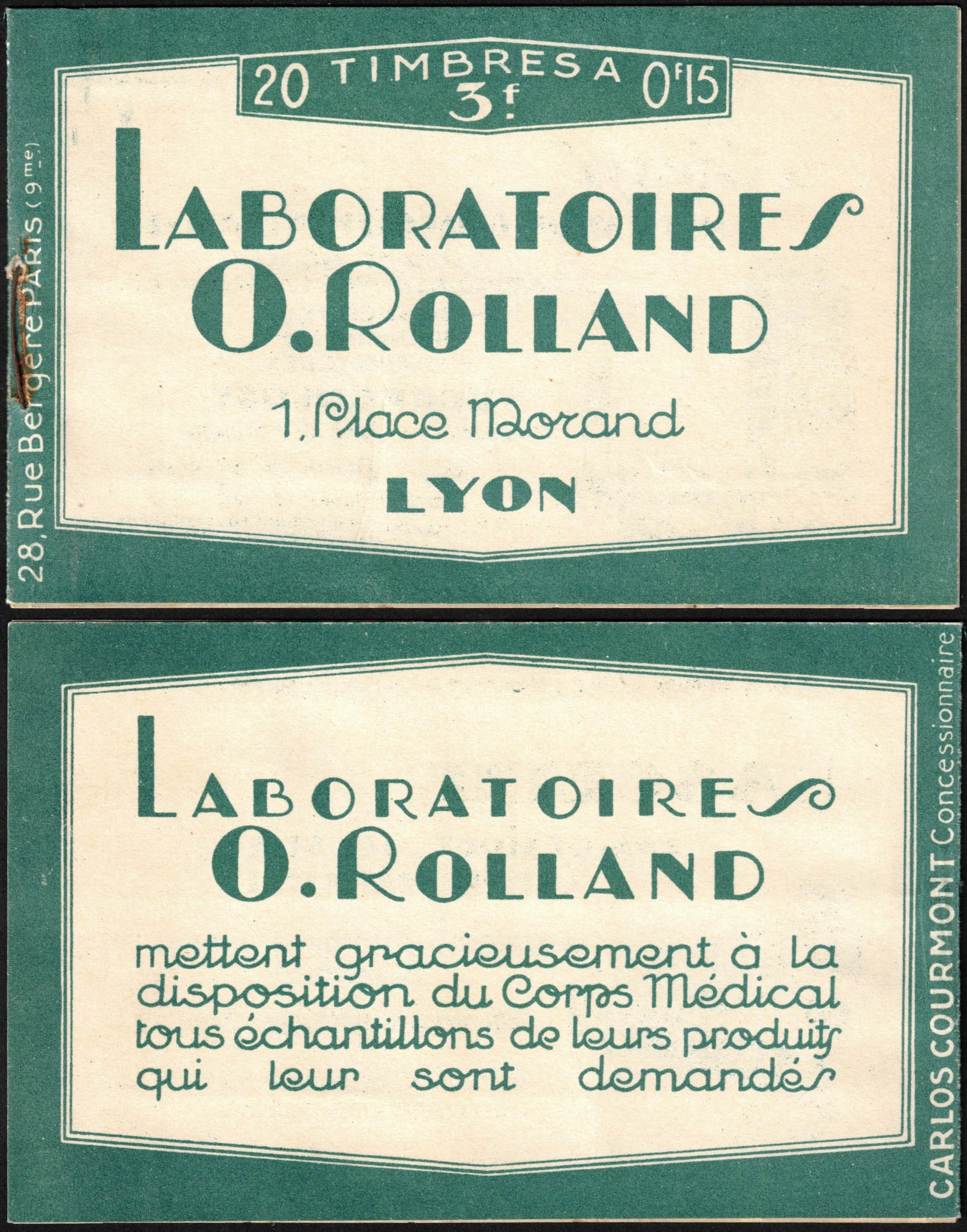 Carnet 189C2 XX - Prix 3f. - Laboratoires O. Rolland - Type Semeuse camée 15c brun - 20 timbres avec publicité (Résyl-Asceine). Cote 400?.