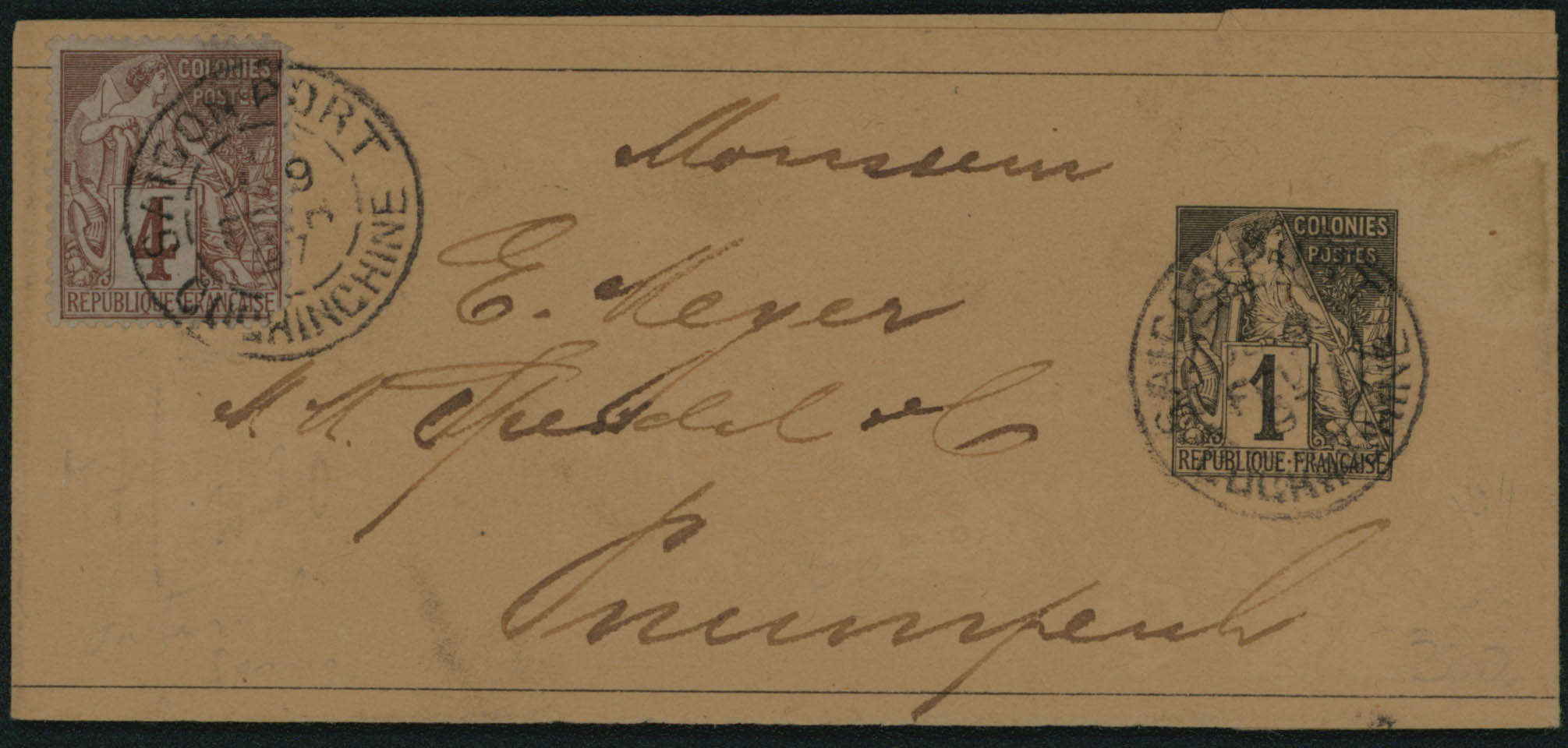 Cochinchine - Colonies Générales bande imprimé complète EP 1c + Yv. 48 obl Saïgon-Port/ Cochinchine vers Phnom Penh. Càd arrivée verso.