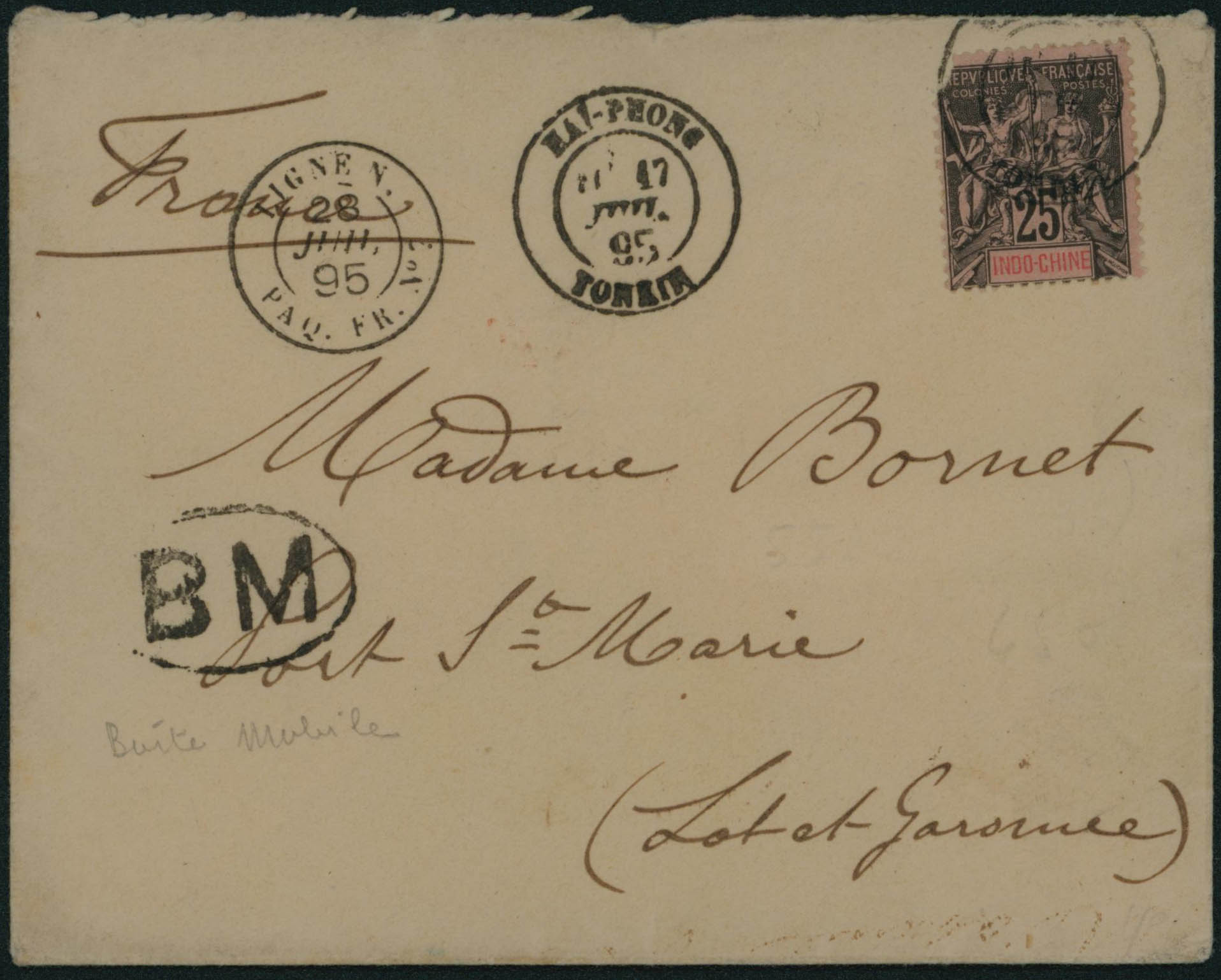 Indochine - Yv. 10 obl Haî-Phong/Tonkin 17/7/95 + Ligne N/Paq. Fr. N°3 vers Port Ste Marie en France. BM dans ovale.