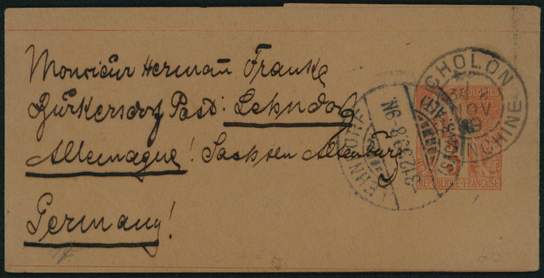 Indochine - Colonies Générales EP 3c obl Cholon/indochine 2/11/99 bande d'imprimé complète vers l'Allemagne, càd Lehndorf 3/12/99.