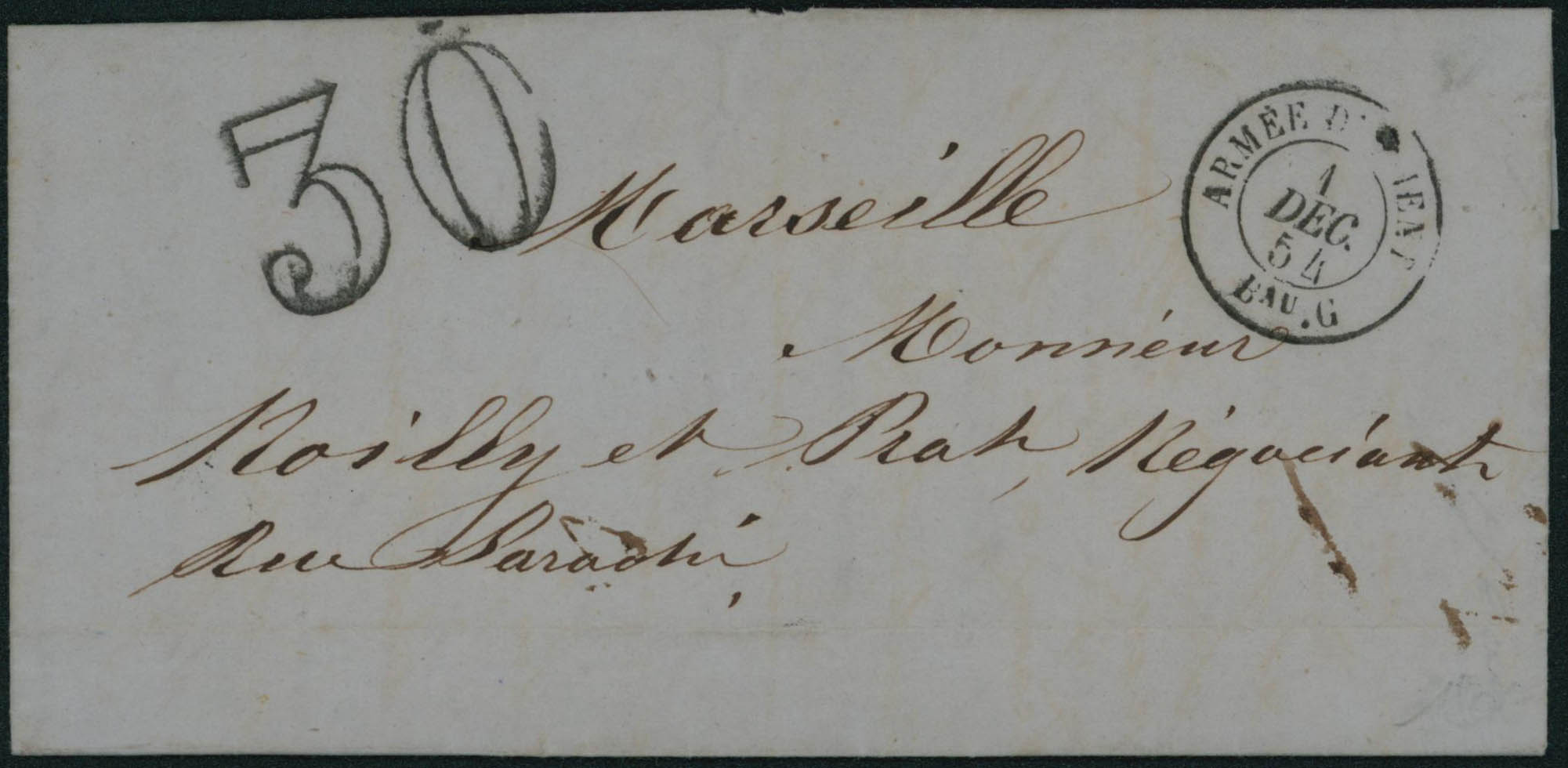 Levant - LAC datée de Gallipoli 30/11/1854, càd Armée d'Orient Bau G 1/12/54 (Constantinople) vers Marseille. Taxe tampon '30'. Càd arrivée verso 9/12/54.'