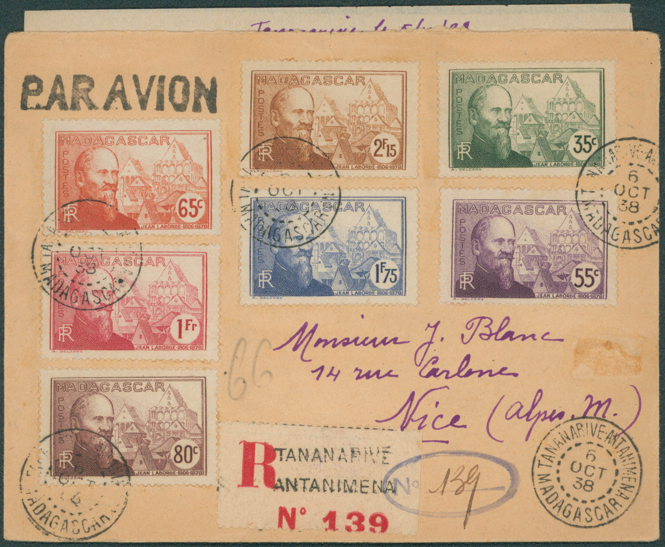 Madagascar - Yv. 199 à 205 obl Tananarive-Antanimena 5/10/38 en rec PA (enveloppe + contenu) vers Nice, càd verso 22/10.
