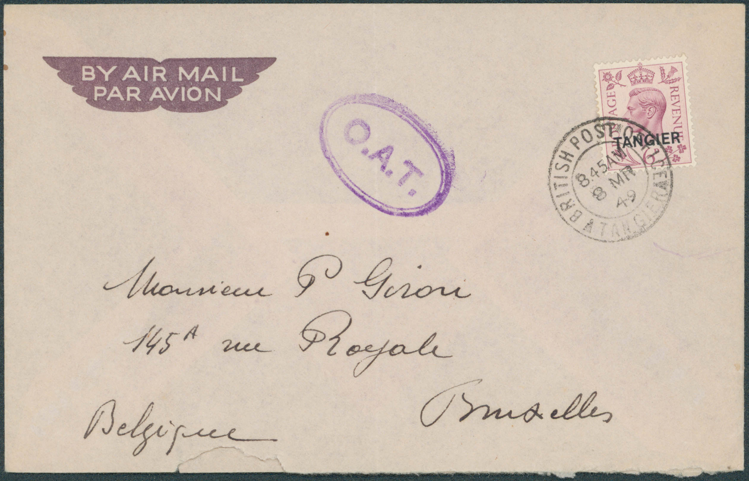 Maroc, zone française - Yv. 34 obl Britisch Office/Tangier 8/3/49 en PA vers Bruxelles. Petite griffe ovale en bleu 'O.A.T.'.'