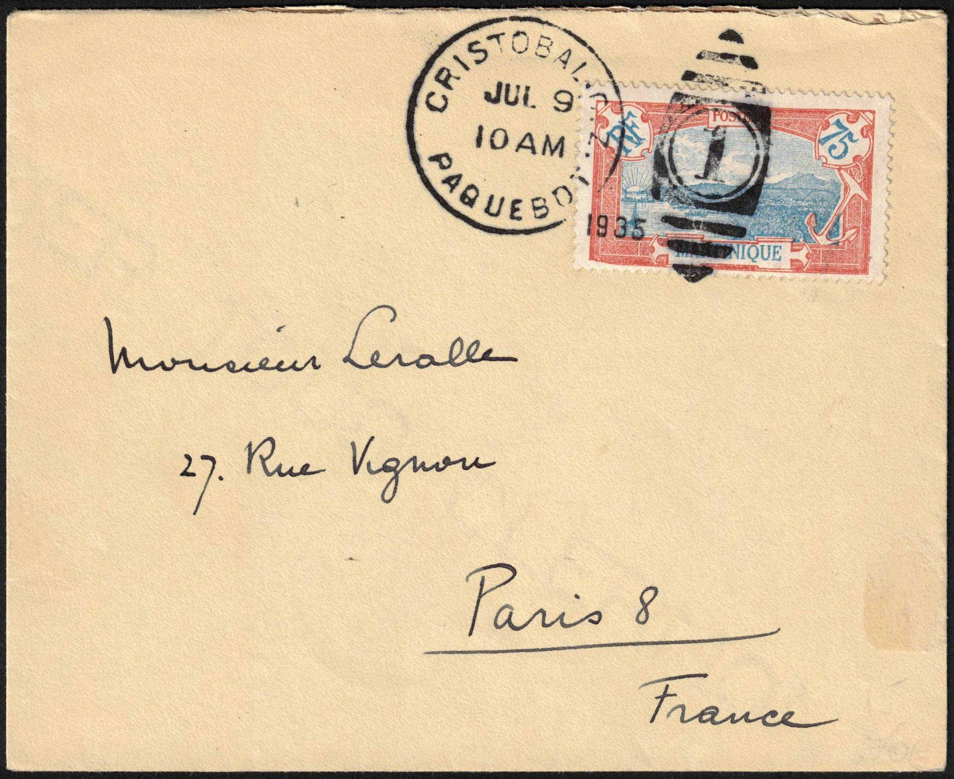 Martinique - Yv. 123 obl Cristobal/Paquebot 9/7/1935 vers Paris, càd verso 24/7.